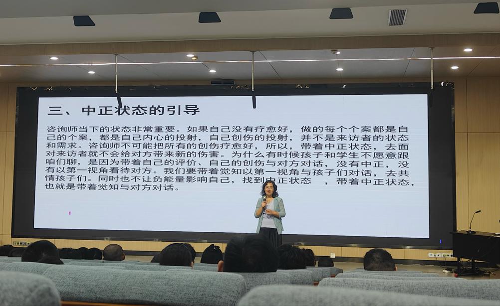 讲座开始前,在座教师提出问题:在一对多的教学场景中,如何及时了解学生的心理状态,捕捉学生心理异常信号,及时做出心理疏导,在话术如何表达方面存在困惑。崔玉萍老师以此为切入点开展心理培训讲座。