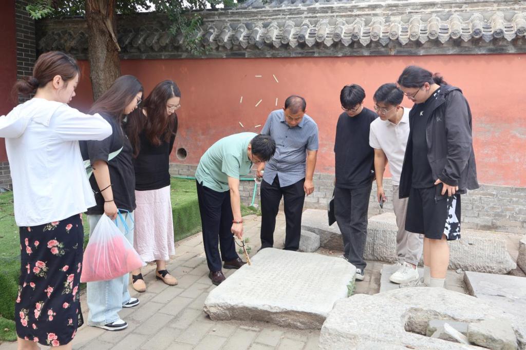 会谈过后,团队成员跟随纪馆长来到了位于山东省聊城市高唐县清平镇的山东省文物保护单位清平文庙。清平文庙内书法碑刻遗存众多,在指导教师杨国栋与朱员的引导下,传承团成员逐个对书法碑刻及相关文献进行了探查和释读。团队成员在碑刻的世界里,领悟到了古人对艺术的执着追求,感受到了中华文化的博大精深,明晰了书法碑刻不仅具有极高的书法学术价值,还具有深厚的历史文化研究价值。