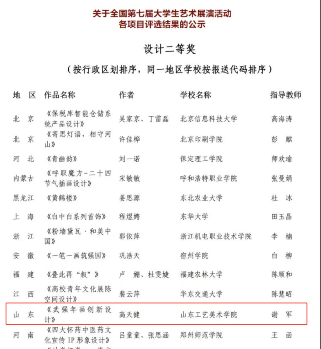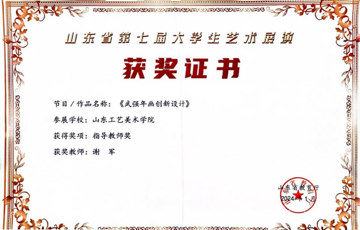 全国第七届大学生艺术展演活动于6月12日至18日在湖北襄阳举行。造型艺术学院21级公共艺术专业学生高天健的设计作品《武强年画创新设计》荣获山东省一等奖、国赛二等奖,也是我校在本次全国展演活动中唯一学生获奖。