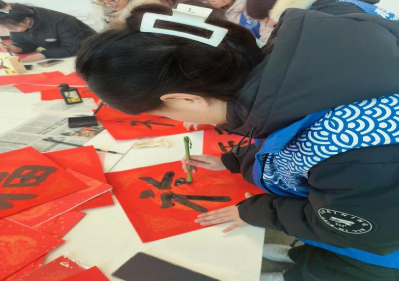 (图为段梦艺为社区写春联)