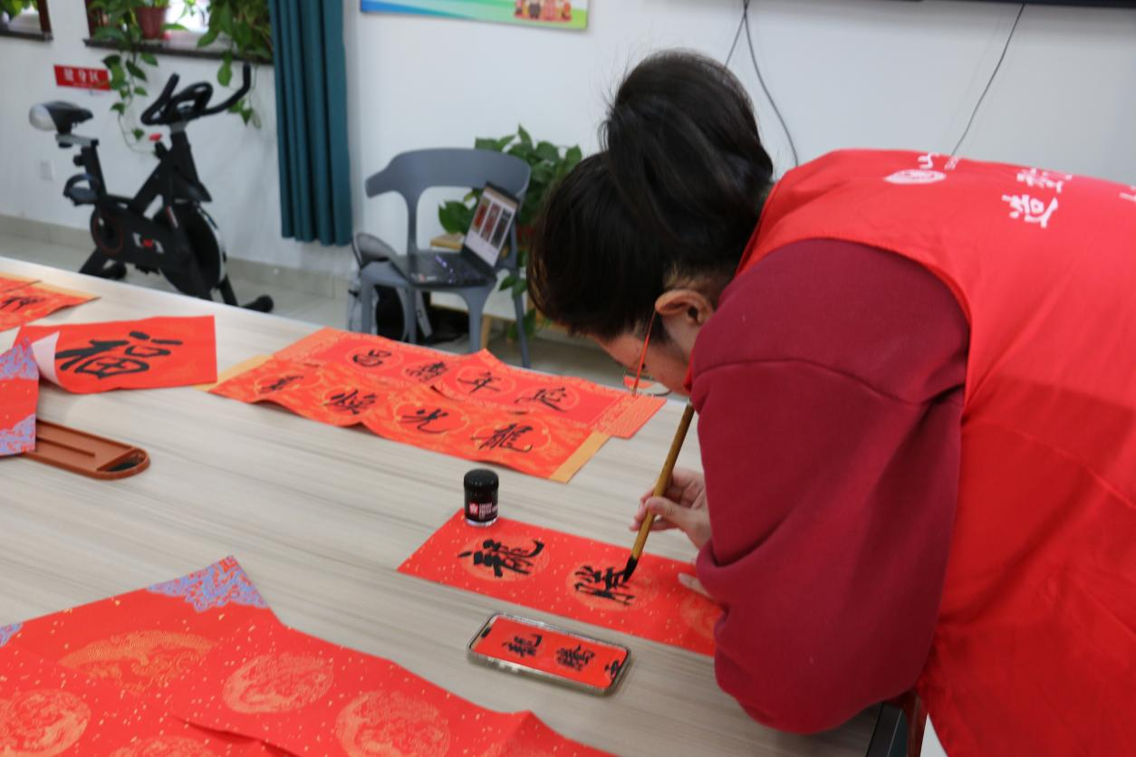 (图为实践团成员在淄博市福泽养老院为老人们书写对联)