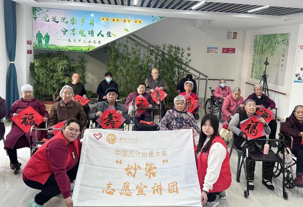 (图为“妙染”社会实践调研团在淄博市福泽养老院与老人们合影)