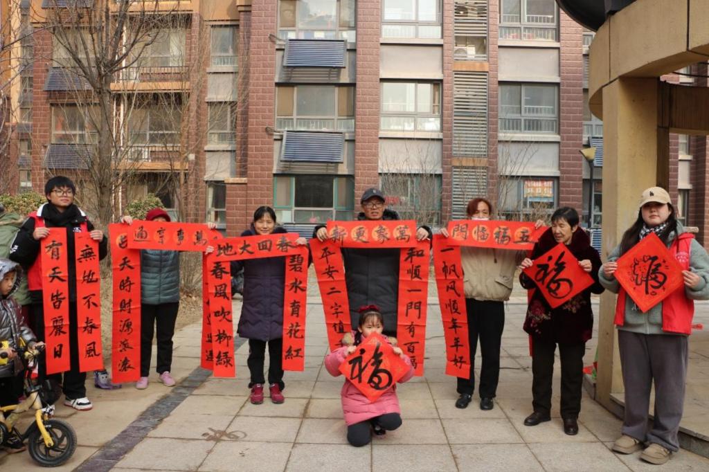 活动现场暖意浓浓。学院志愿者充分发挥书法专业特色,墨香四溢,一行行俊逸的书法,一句句真诚的祝福,一幅幅精美的“福”字,寄托了同学们辞旧迎新、祈福纳祥的美好愿望,为即将来临的春节增添了浓浓的喜庆氛围。期间,志愿者们将写好的对联分发给社区居民。红色的对联纸上,流淌着浓郁的中华文化,传递着对新年的美好祝愿。居民们手里捧着刚刚领到的春联和福字,精神愉悦,情绪高涨。他们纷纷表示,此次活动不仅弘扬了中华优秀传统文化,渲染了节日氛围,也方便了百姓日常生活,希望以后可以多举办此类活动。