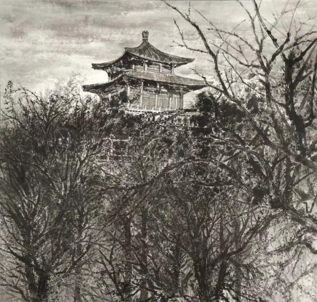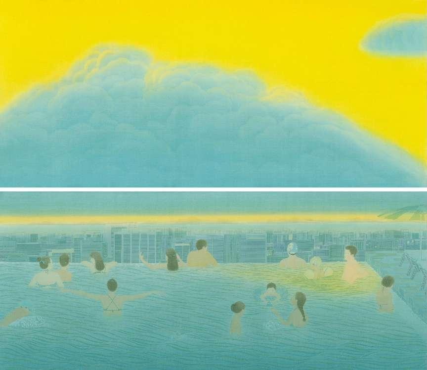 王玉晓《楼顶的浴者》中国画(绢本)170×195厘米