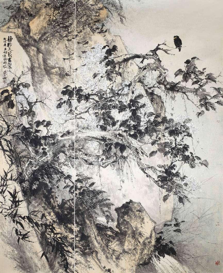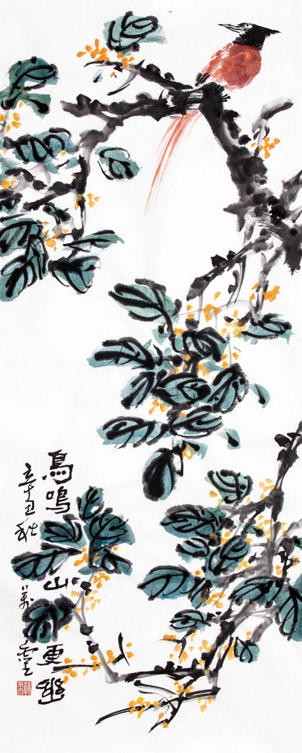 孙万灵《鸟鸣山更幽》中国画69×138厘米