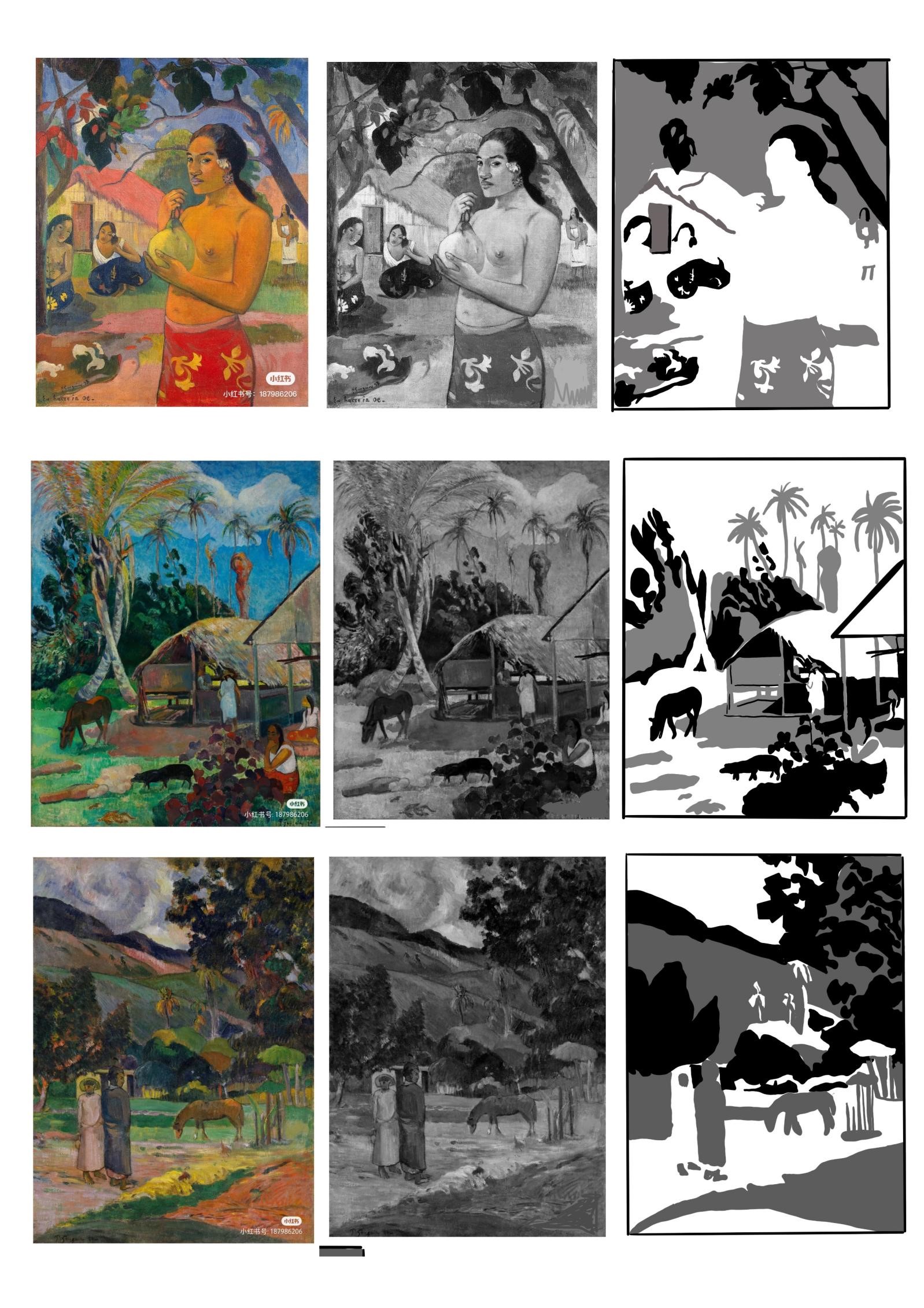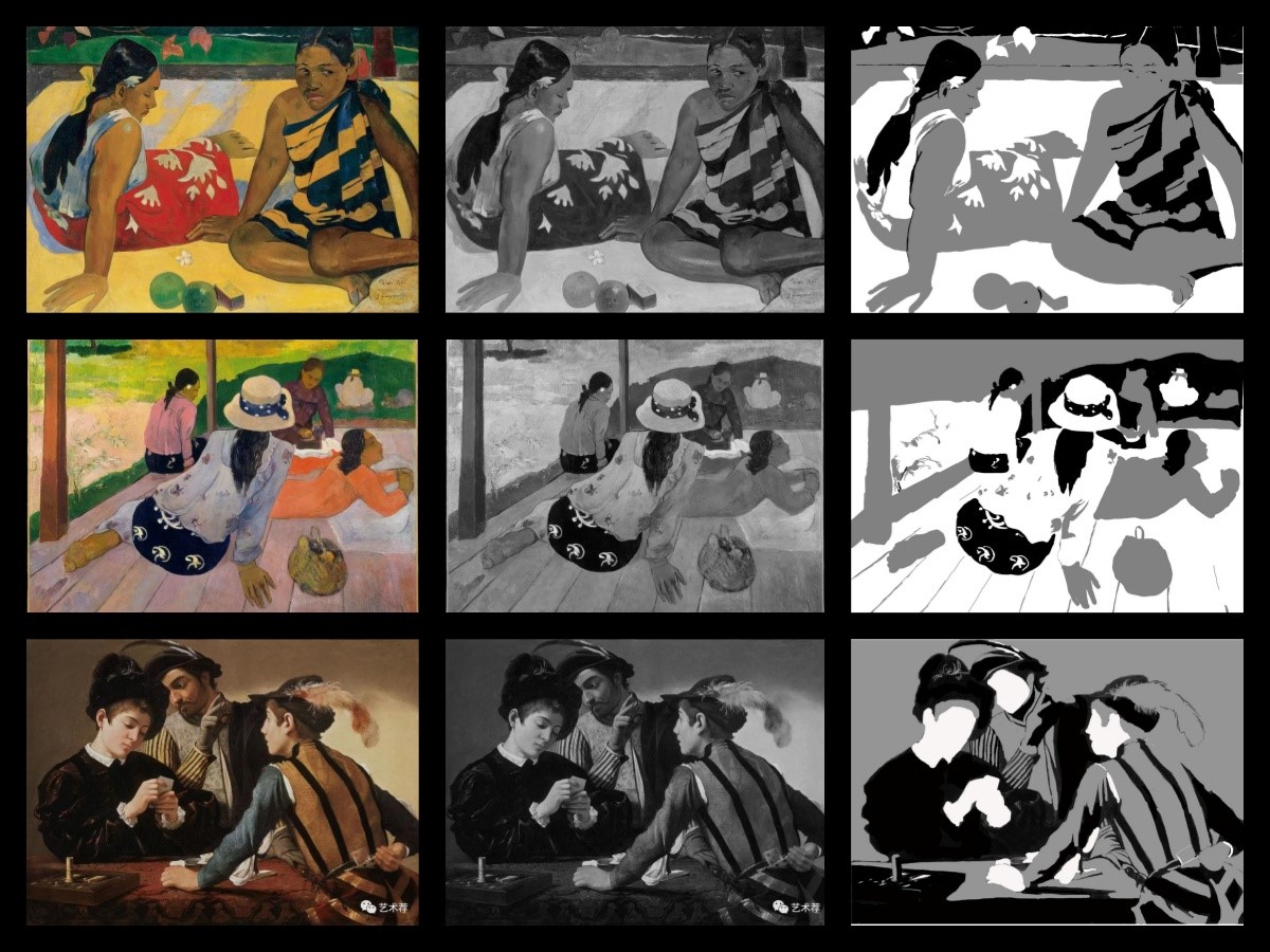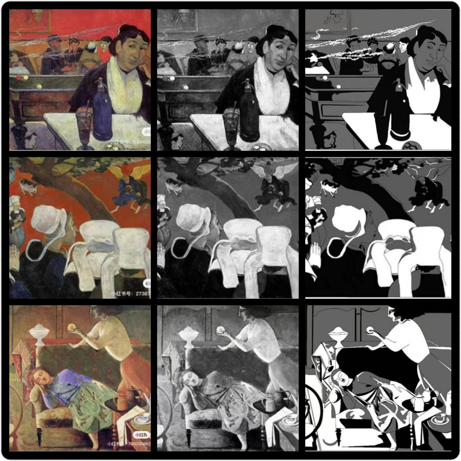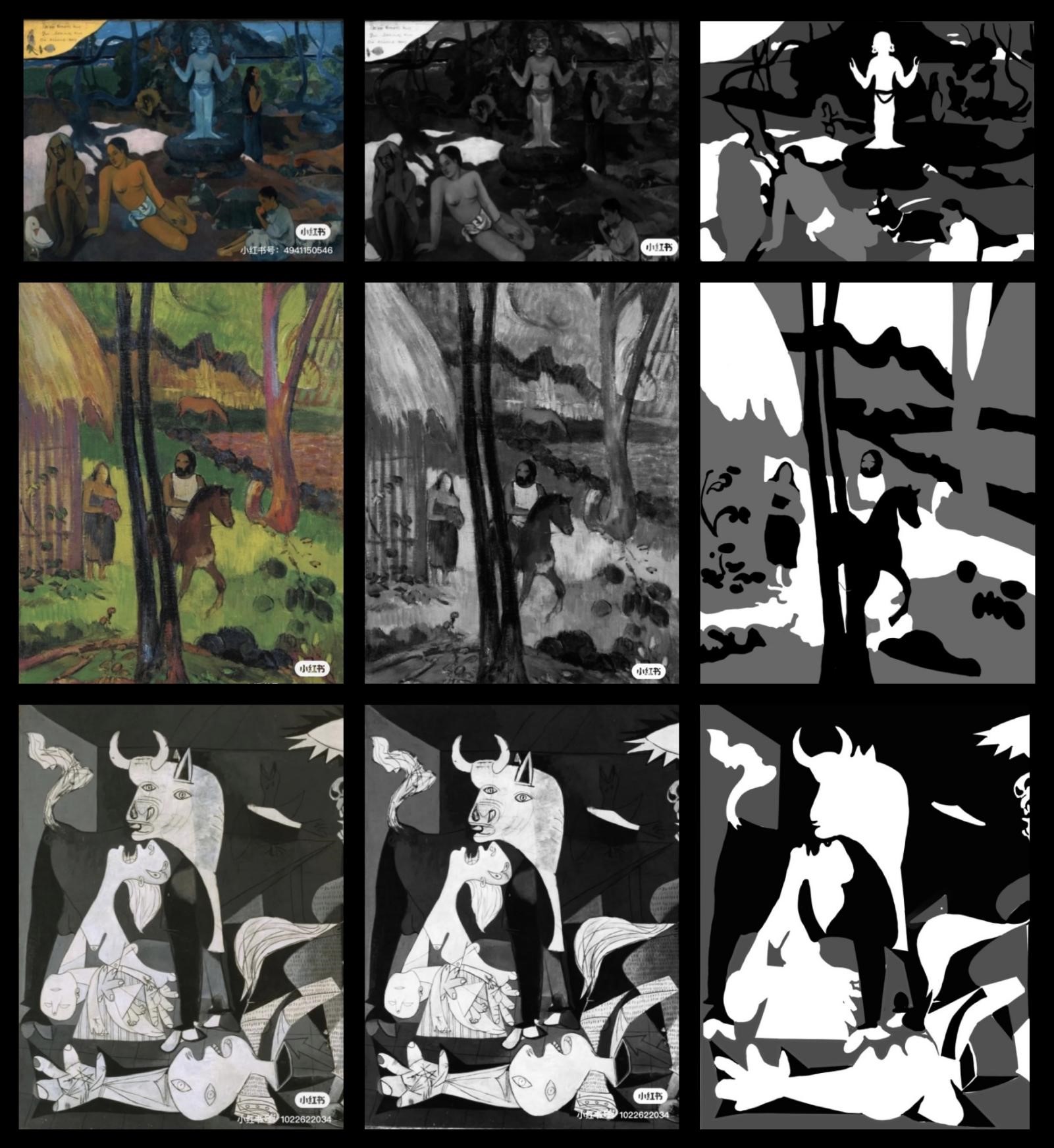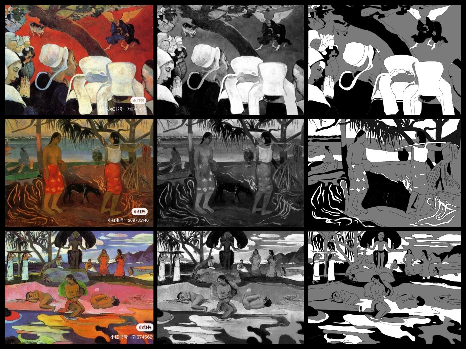 1、选取大师经典作品进行黑白灰训练,首先要求学生将大师作品用PS软件或美图软件转化成黑白照片,然后对黑白图片进行黑白灰图层的归纳和提取,概括出画面黑、白、灰三层关系,注意临近明度的整合,归纳出画面的色调关系,分析作品中黑白灰的面积、位置、点线面关系。通过此项练习让学生敏锐的捕捉到作品中的黑白灰关系,拉开他们之间的对比,并且丰富画面,为之后的创作打下基础。