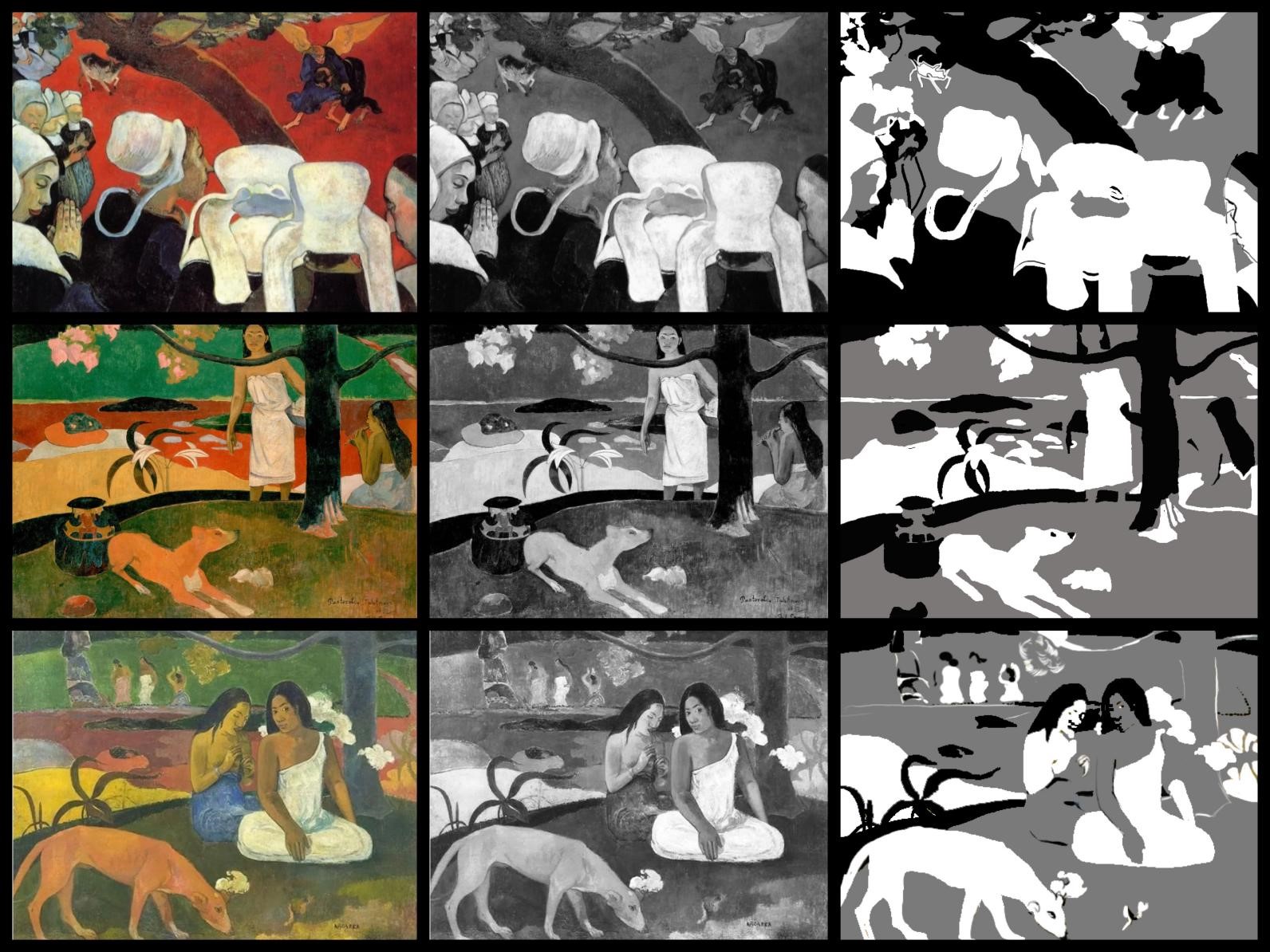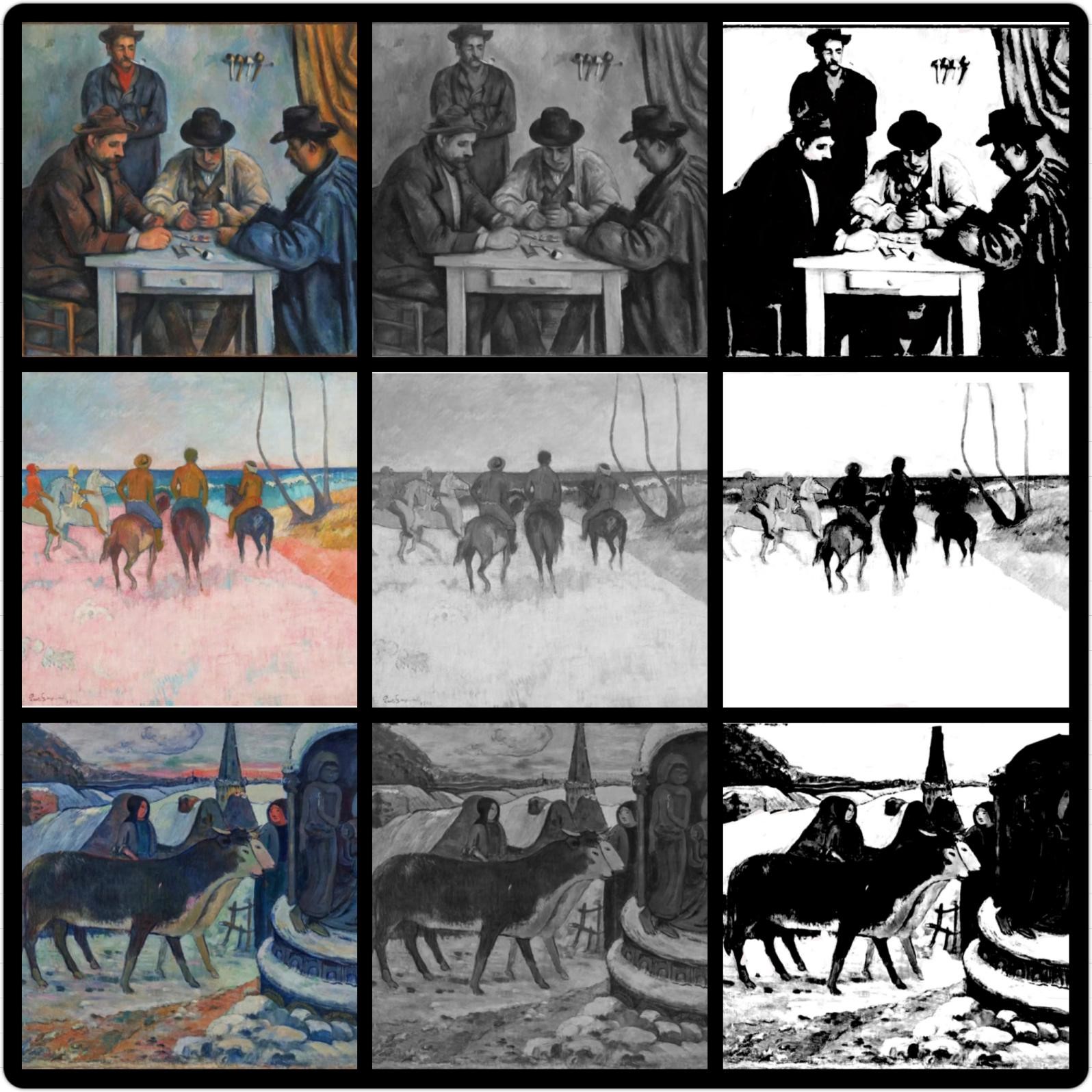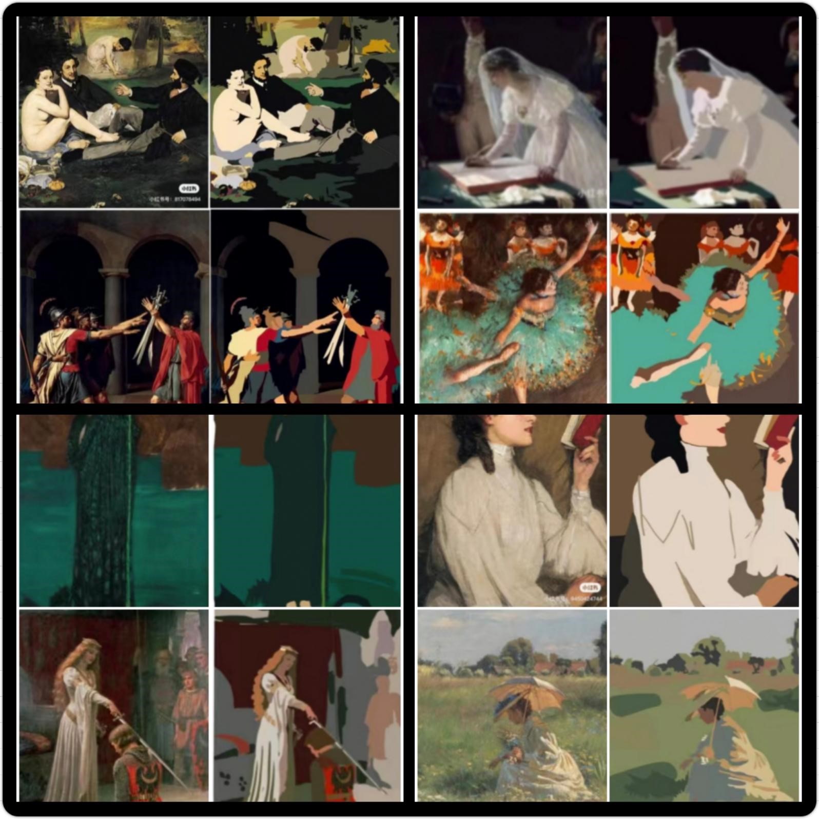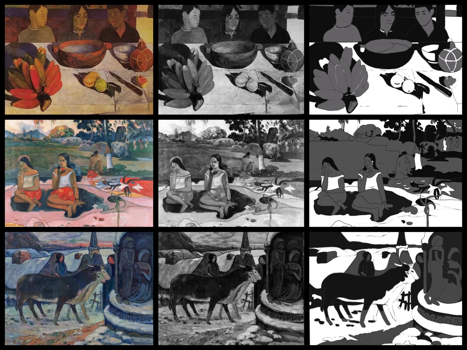 1、选取大师经典作品进行黑白灰训练,首先要求学生将大师作品用PS软件或美图软件转化成黑白照片,然后对黑白图片进行黑白灰图层的归纳和提取,概括出画面黑、白、灰三层关系,注意临近明度的整合,归纳出画面的色调关系,分析作品中黑白灰的面积、位置、点线面关系。通过此项练习让学生敏锐的捕捉到作品中的黑白灰关系,拉开他们之间的对比,并且丰富画面,为之后的创作打下基础。