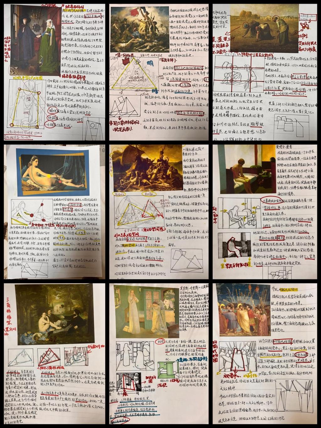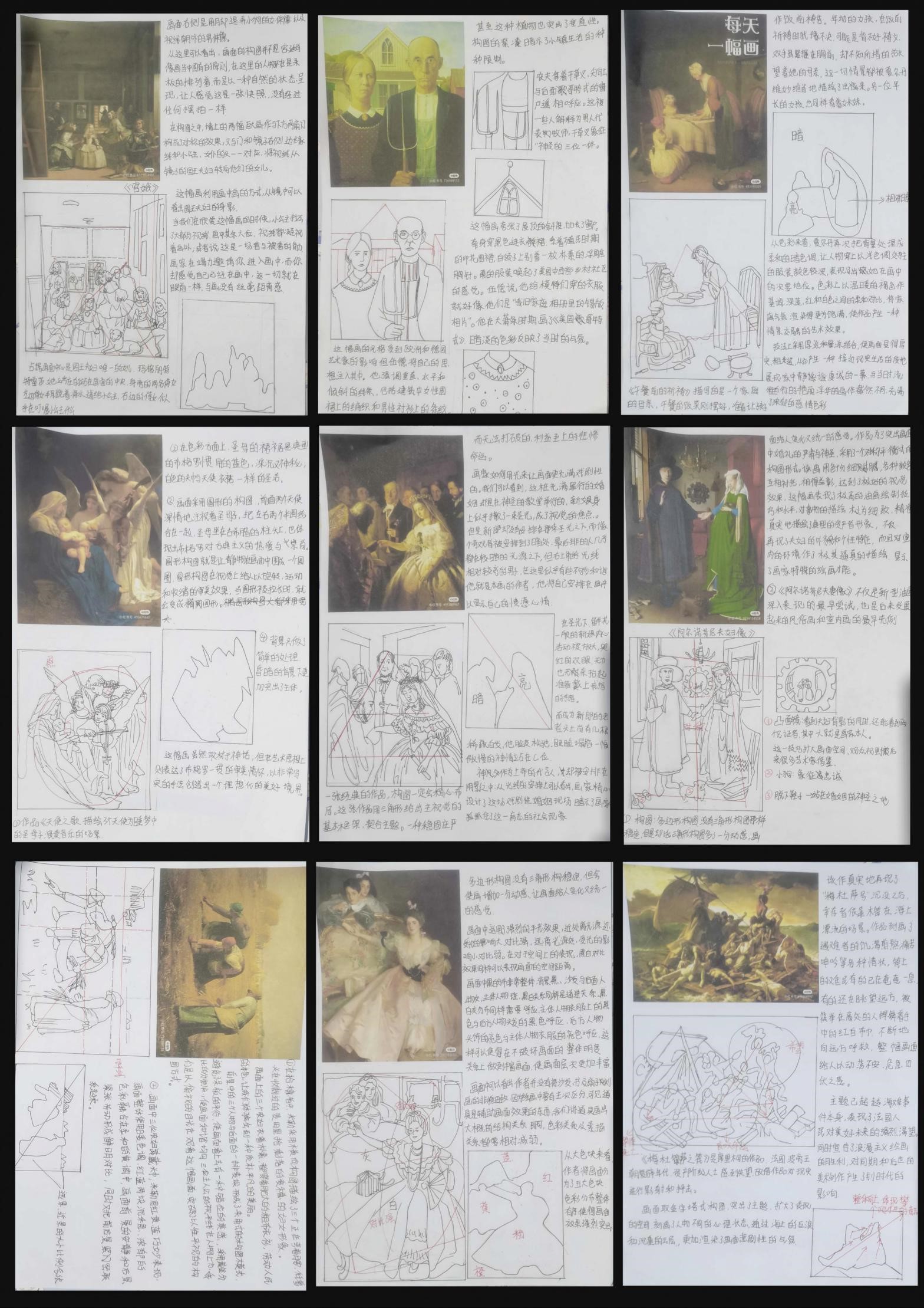 通过对大师作品的构图进行分析,掌握大师创作中的构图规律,分析三角形、圆形、菱形、长方形等各种构图的样式在创作中的具体运用。通过不同颜色的辅助线来加以分析,更全面深入的解析作品的形式与语言要素,掌握不同形式的构图方法和规律,参照经典作品图示的成功范本,剖析其形式,内容的和谐统一及最佳程式及在绘画表现形式中的品质和重要性,每个学生完成经典大师作品构图分析十张,选取大师作品要求不少于三个人物的组合构图,通过多人物的组合训练来掌握构图的要领,为自身创作积累经验。