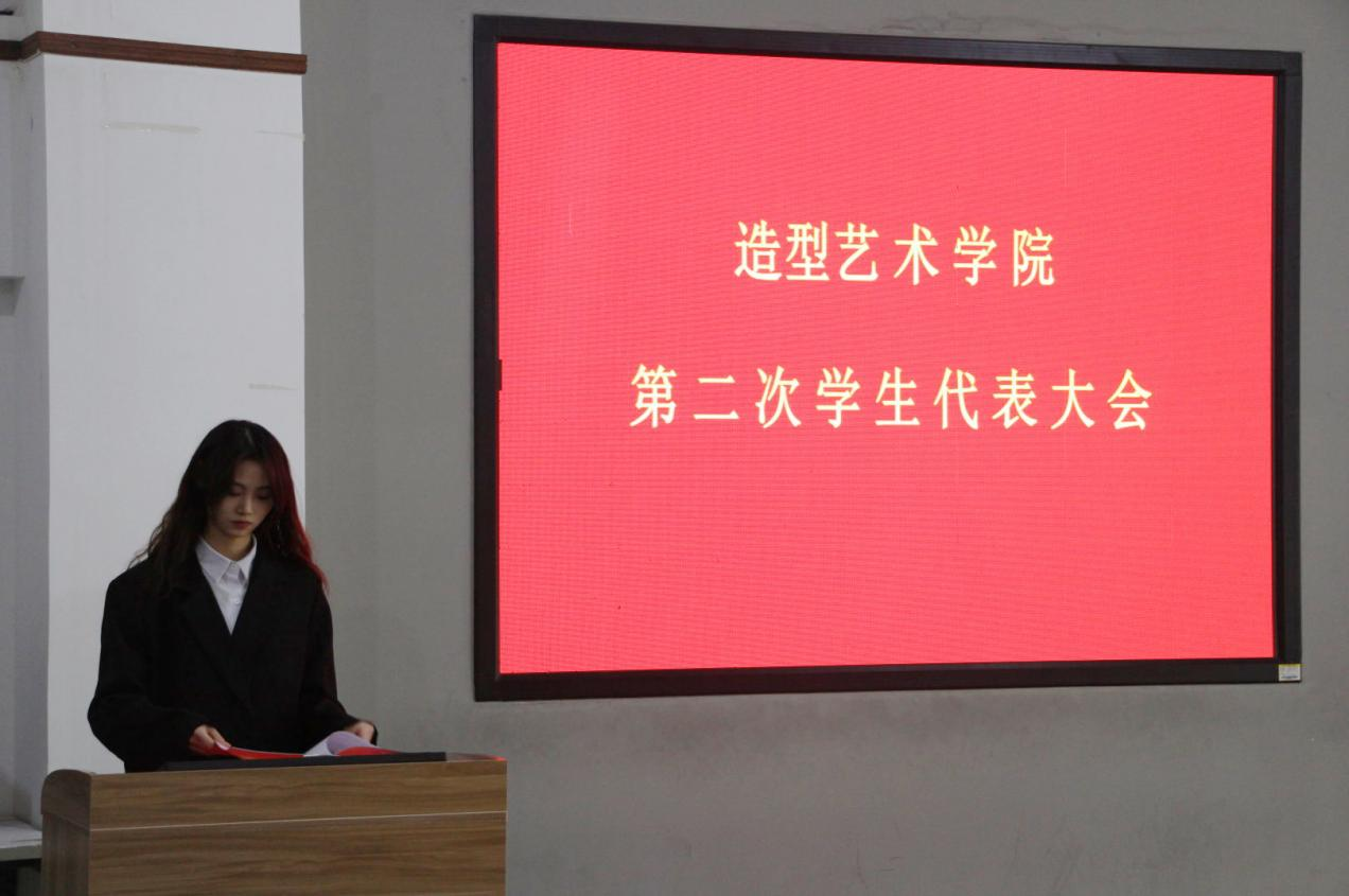 主持人王春晓宣布造型艺术学院第二次学生代表大会开幕,全体起立,奏唱国歌。
