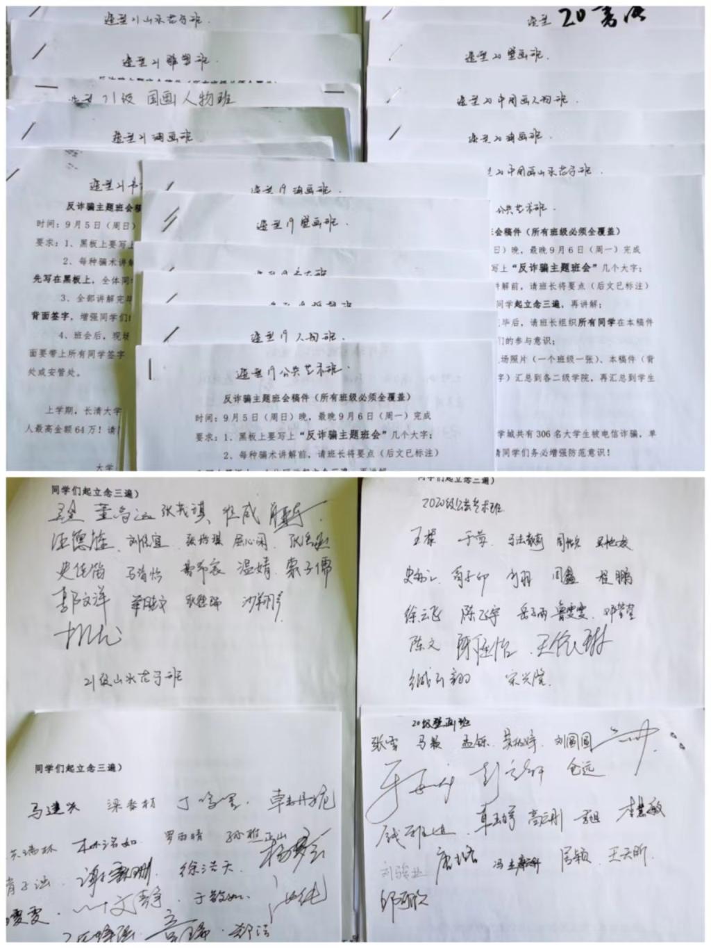 本次活动以宣传反诈知识为主旨。会议伊始,各班班长带领全体同学对大学生常见的5种诈骗类型进行宣读,加深学生区分诈骗类型的意识。各班委向同学们介绍大学生常见的几种诈骗类型及网络诈骗案例,并重点对长清大学城区域内发生的电信诈骗案例进行详细的解析,使安全教育入脑入心,进一步构建和平安全的校园环境。本次反诈骗班会的开展,提醒同学们在学习生活中养成良好的上网习惯,注意个人信息安全,谨慎发布言论,谨防网络诈骗,注重交友安全等。活动中,造型艺术学院各班学生积极参与,纷纷讲述自己对于反诈骗知识的理解,并分享自己识别诈骗的方法,并以签名的形式响应倡议。