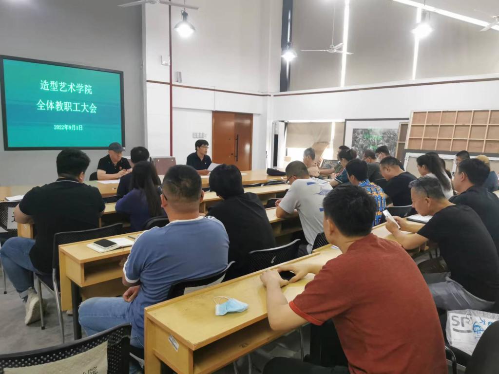2022年9月1日,造型艺术学院在四楼多媒体召开新学期第一次全体教职工工作会议。造型艺术学院院长刘宁、党总支书记李希进及全体教职工参加会议。
