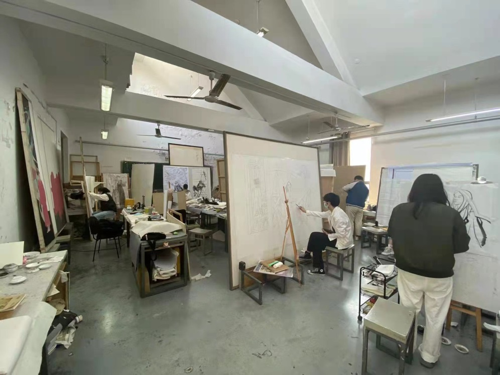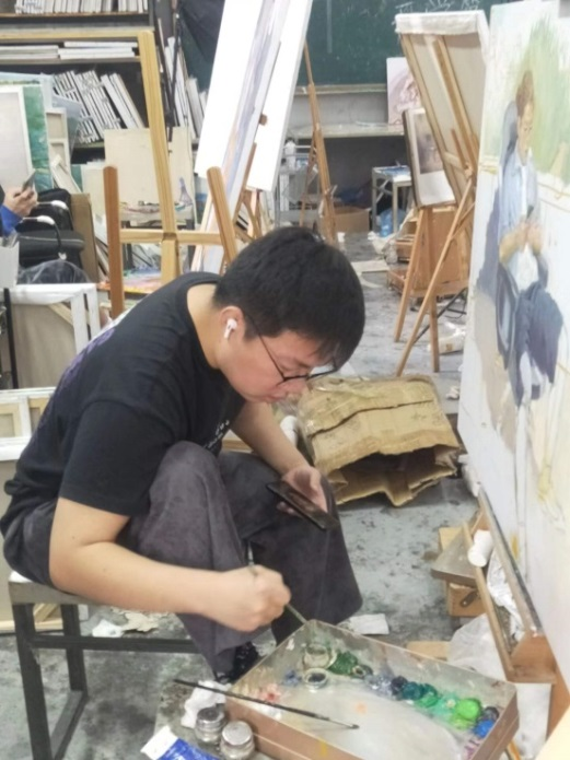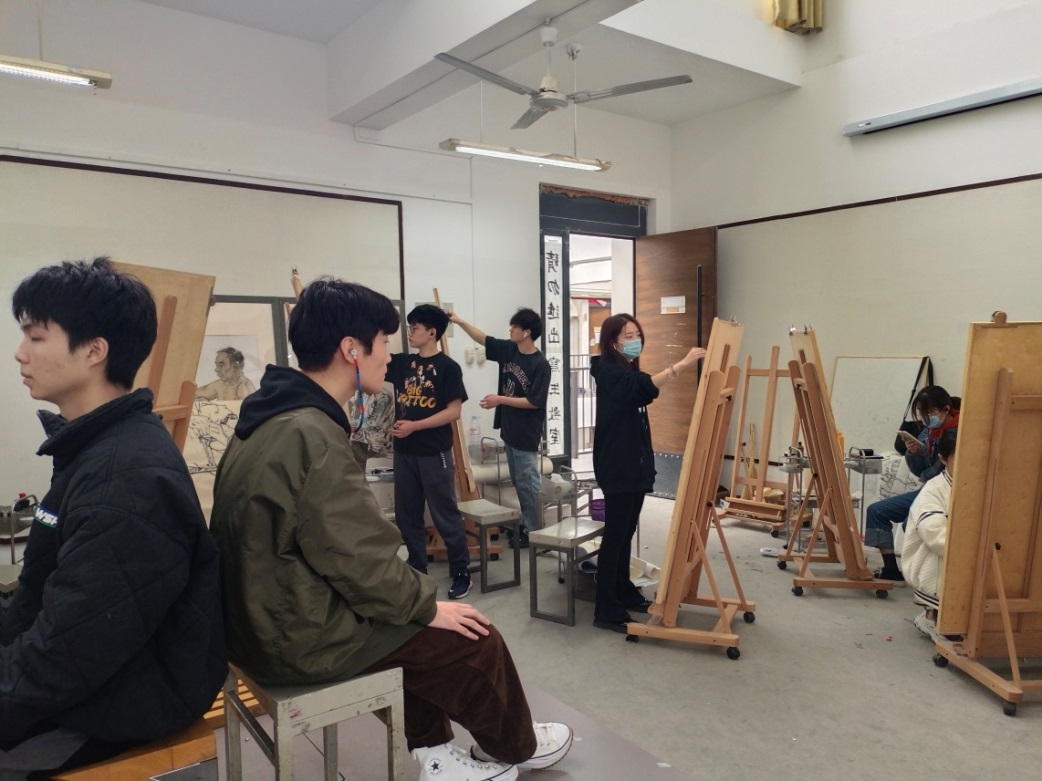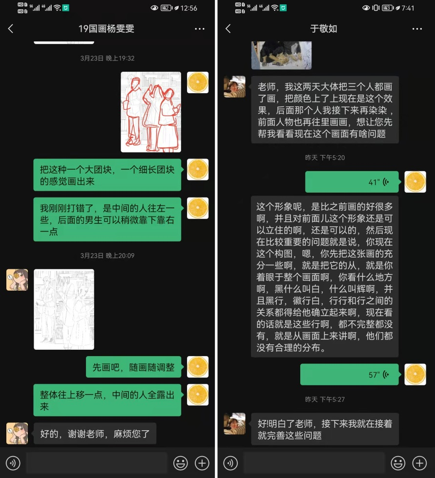 美术创作本质是一种个性化的、创造性的行为活动。在教学中,创作手段和方法的掌握,既要充分发挥学生的主观能动性,也要“因材施教”,发挥课堂教学的针对性,所以,创作课程的教学非常注重教师对学生一对一的指导和探讨。美术创作的过程往往是连续的、不间断甚至一气呵成的,课上的学习时间是十分有限的、是难以满足创作实际需求的,尤其是创作理念的延续和完善,作品表达的充分和完整,都需要将教学所在的所有课上下时间纳入教学,扩充教学进行的范围,才能帮助学生实现作品的真正完成。在目前线上教学的条件下,更加需要利用信息平台,增加师生交流、拉进教学距离,深入创作专业探讨、挖掘创作情感理念。所以在教学实践中,任课教师除了课上的辅导与讨论外,课下也及时与同学通过微信、QQ交流联络,为学生及时答疑解惑。
