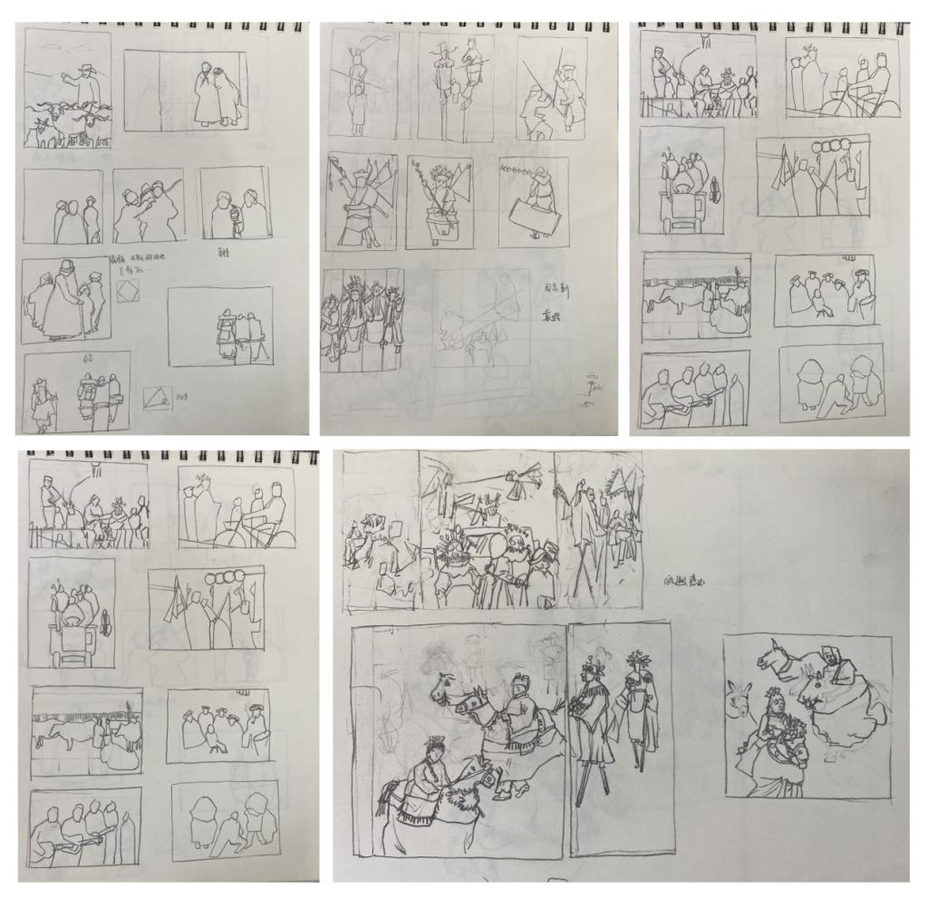 前五周为线下教学。主要课程内容为:第一周讲授基本的创作理论与图式研究理论,梳理基本的创作过程,通过具体的作品,引导学生进行图式分析;第二、三周,辅导学生进行搜集素材,确定本次课程创作的题材与主题,进行小草图的练习。第四、五周以确定的草图为基础,进行黑白稿和色彩稿练习。