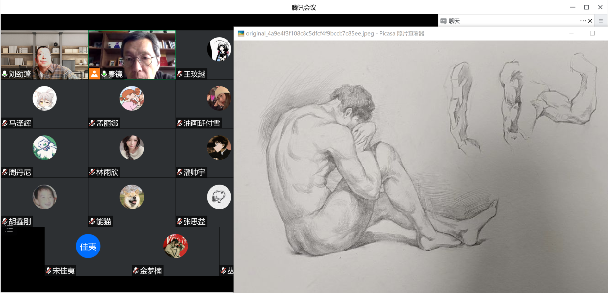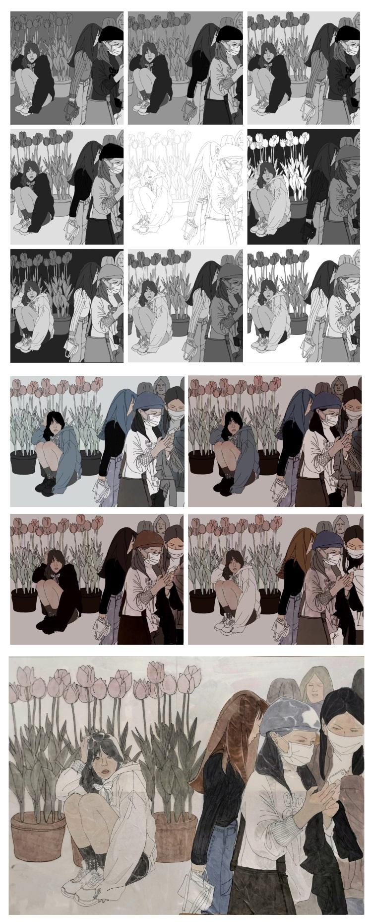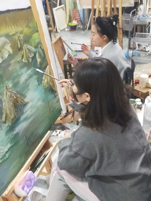 因为疫情的原因,我们的课是在网络上进行的,通过这节课上樊老师和丁老师的讲解和耐心的修改,我们积累了一些画作品的经验,从先前不会思考作品的构图黑白色彩到能自己理解作品的内涵,创作能力提高了,画画的时候也会更多的思考了。
