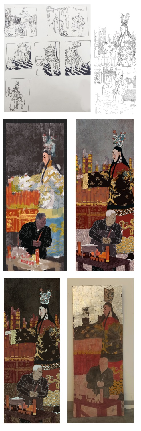 这张创作的主题是我家乡福建的民俗特色游神,无论岁月如何变迁进香日与神诞始终是福建人时间观念里的那根弦,网络上戏称追星也叫不起来的福建人让他们去迎神三点就能起来抬大轿了。这是联幅里其中一张,我尽量在画面上增多细节出现的人物和神像偶偏靠肃穆的方向描绘,并使用岩彩创作来表现画面的浓烈厚重。