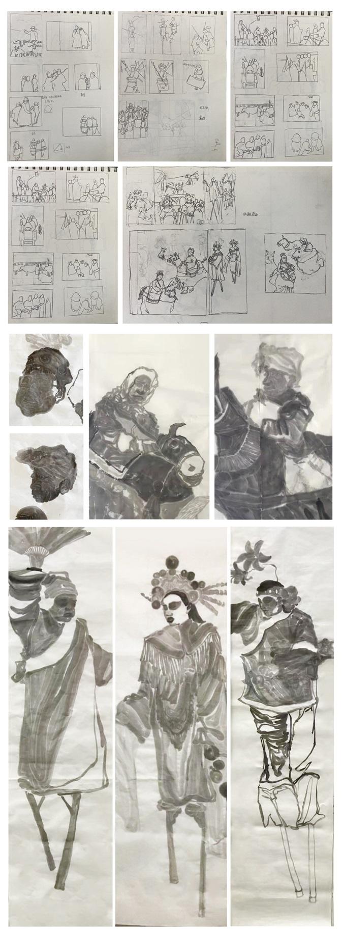 《图示研究与创作》这门课,让我收益良多,以水墨的手法,第一次真真实实的从构思构图,然后确认小稿和色稿,最后呈现到正式稿上。更加丰富了自己的专业知识水平,相信通过这次学习,可以让我接下来的艺术创作更有自信。同时让我感受到了水墨人物的趣味性,了解到了实践的重要性。水墨的难度系数相对较高,也是我所欠缺的,老师们非常耐心的解答我的疑惑,也让我不断成长。了解了只有通过自己不断地试错,反复的练习才能达到效果,然后通过老师的引导,逐渐达到自己理想的效果。