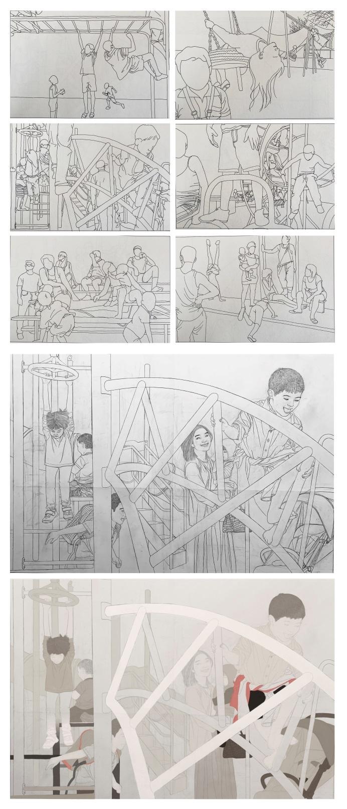 构思这幅作品时是三月初,节气正是惊蛰,“春雷响,万物长”,对于一个国家来说儿童最能代表这种朝气蓬勃的生命力,所以我构思出了一群小孩子玩耍的画面,与节气惊蛰相互呼应。