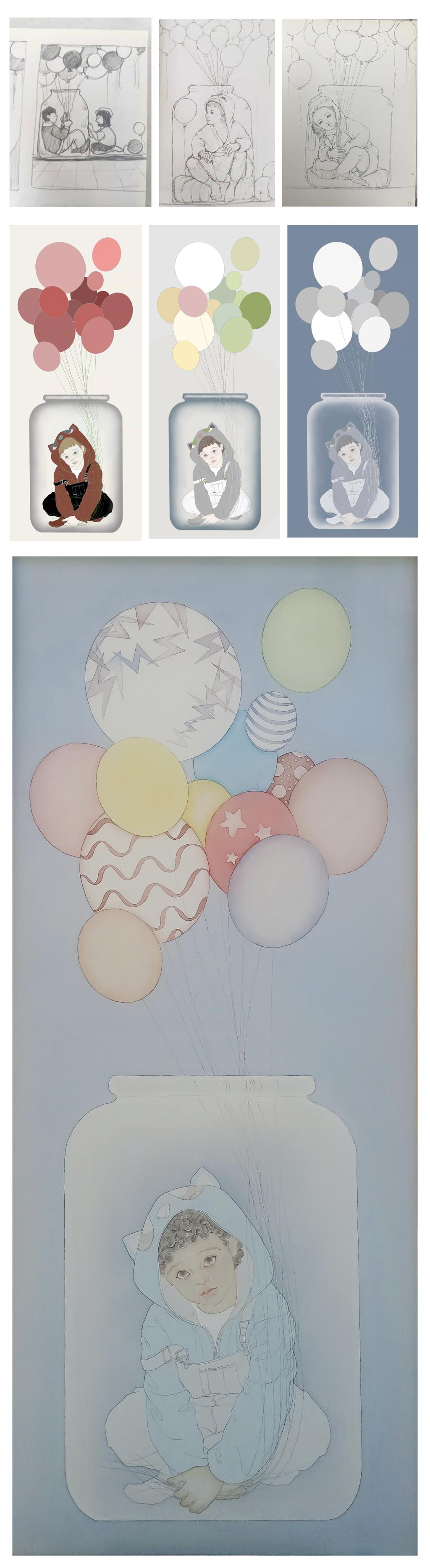 画这幅画的时候想起以前看到过的一个小孩子,内向又羞怯,沉浸在自己的世界里,明明有着孩童的外表却缺少了小孩子的笑容。他身上的孤独气息令人心疼,就好像瓶子中的娃娃,望着外面的世界,却无法触碰。
