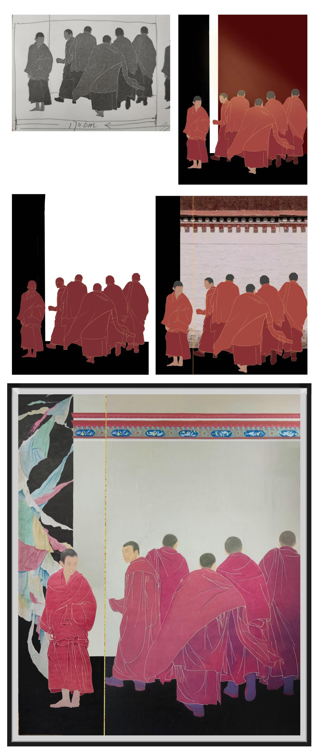 这次画的主题是以戏剧为题材,艺术源于生活,并高于生活。将现实世界中的人物形象与生活场景进行艺术加工,将现实的实物转化成艺术的图示拼接。将水墨效果以平面化进行处理。