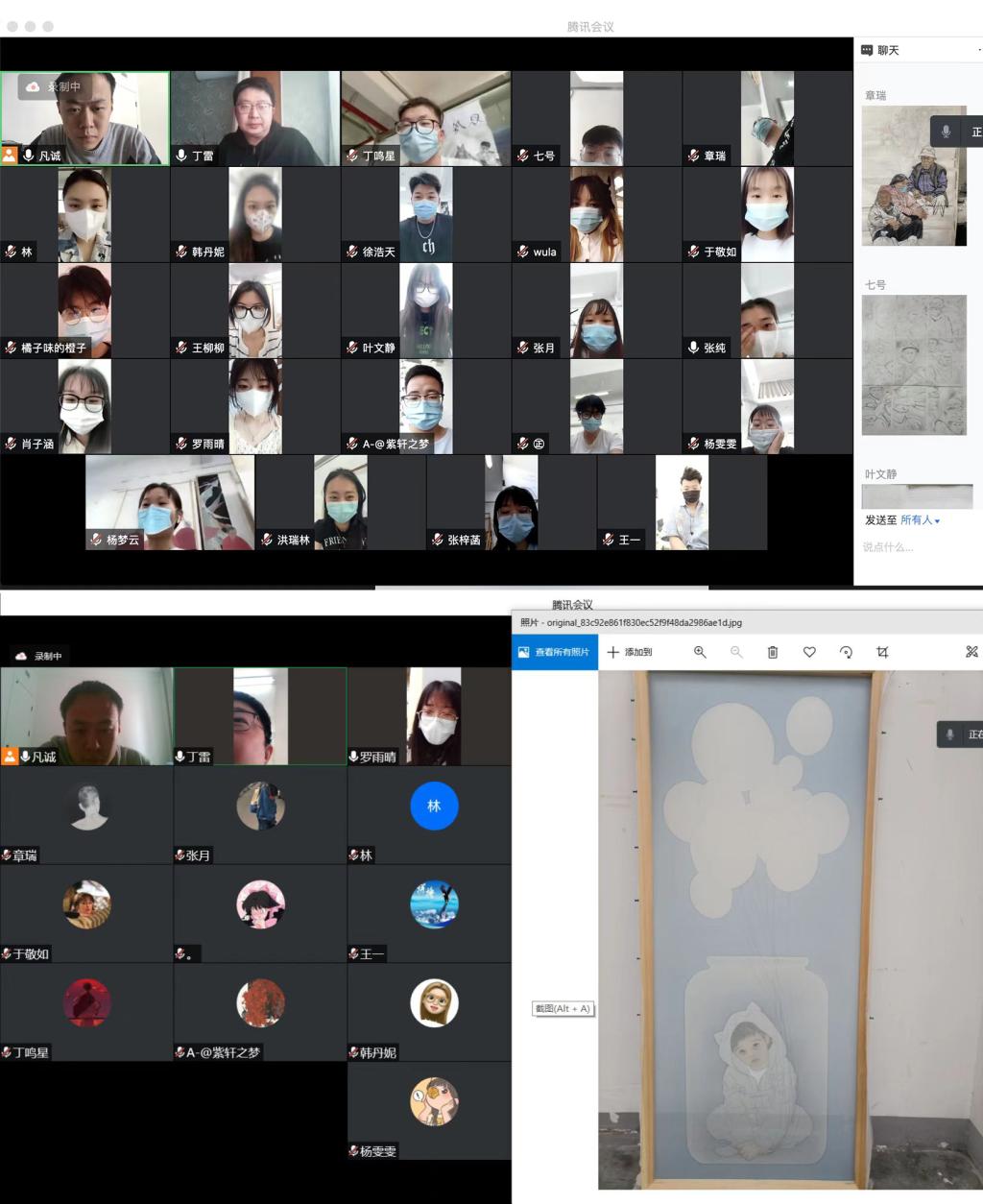 因为疫情的原因,我们的课是在网络上进行的,通过这节课上樊老师和丁老师的讲解和耐心的修改,我们积累了一些画作品的经验,从先前不会思考作品的构图黑白色彩到能自己理解作品的内涵,创作能力提高了,画画的时候也会更多的思考了。