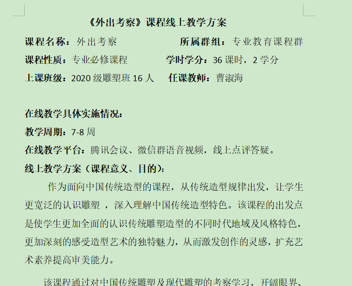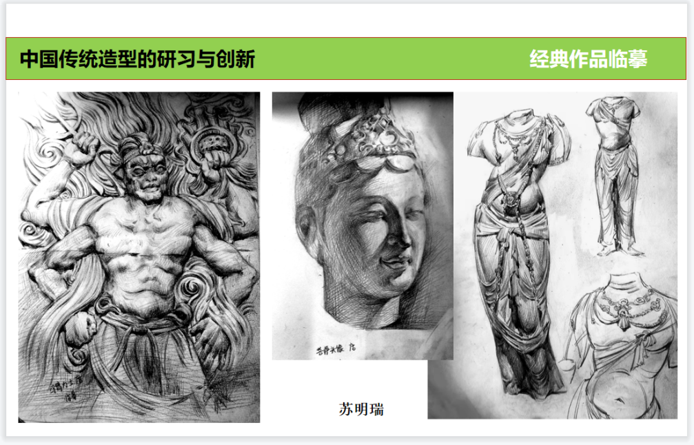 由于疫情防控影响,及时制作线上课程教学方案,力争保质保量的完成课程教学与学习。根据现实状况,外出考察的课程计划改为:“云游石窟美术馆”+网络资源导学+经典作品临摹与创作+“双创”优秀案例云端汇报+创作方案云端讲评的混合式教学方式进行。