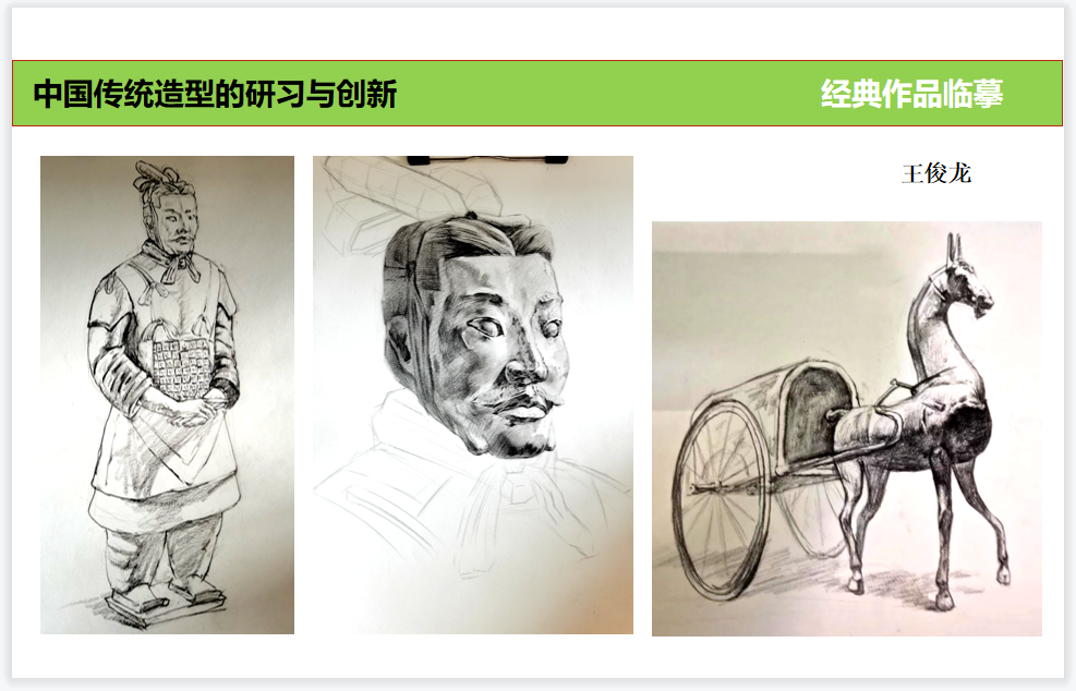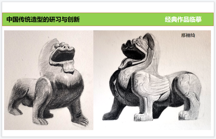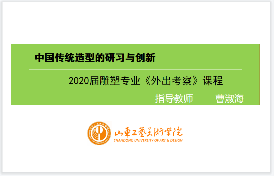 潘鲁生院长在造型学院调研时指出,课程教学要贯彻落实“双创”方针,将“双造”引入课堂,把“山东手造”全面融入教学、科研、社会服务、文化传承。在本次课程内容设置上更多将中华造物艺术体系、中华造型艺术体系融入课程,通过对中国传统造型及传统造物的多角度深入考察学习,补充学院派雕塑教学在中国传统造型规律认识上的不足,从而补充学习中国传统文化,更宽泛的认识雕塑,更深入的理解中国传统造像艺术独特魅力。在课程实践构思创作阶段,结合时代发展及贴近人民要求,将创作构思更多向中国传统造型方向引导,实现中华优秀传统文化创造性转化、创新性发展。