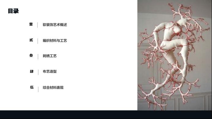 理论部分:介绍纤维与软性材料,结合大量的优秀案例,分析当下软装饰艺术的发展趋势和多元化的表现形式,拓展学生对软装饰艺术的认知与了解,鼓励学生自主展开相关素材的搜集与关注。