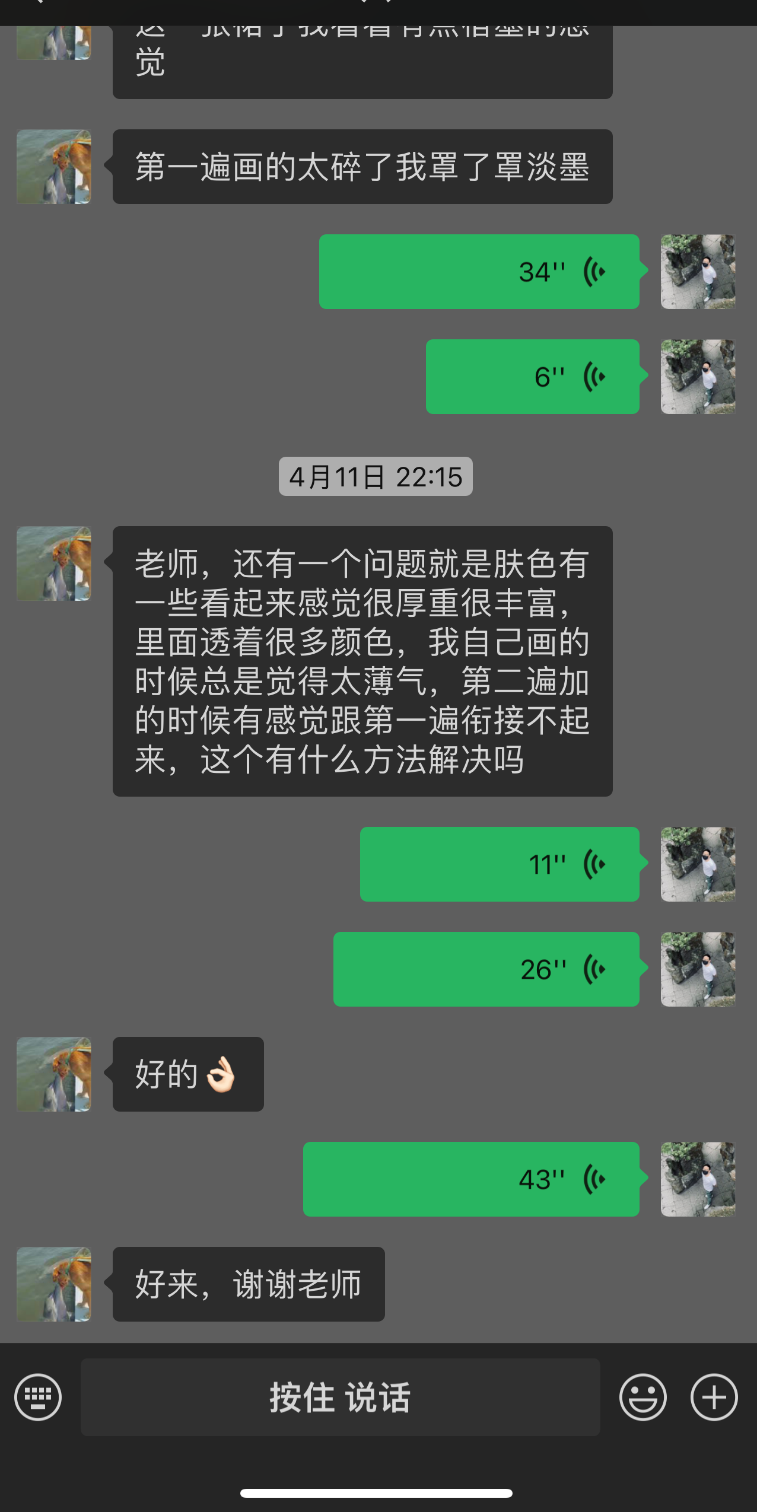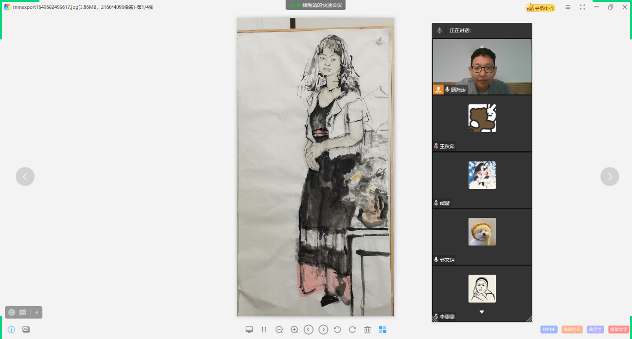 这次的中国画临摹专业课程虽然是线上进行,老师无法进入课堂指点我们。但是每天上午顾海涛老师的点评都十分的详细,围绕每个同学的作品深入讲解有哪方面的不足以及之后需要改进的大方向,小细节。感受到了老师对我们的关心和关注。另外,我们还可以随时通过班级群聊或者私信的方式随时向老师提出问题,这很大程度增加了学习的便捷程度。同时,也提升了我们的积极性。这让线下课程的不便捷程度降到了最低,让我们学习更加认真细致,得到了更多的感悟。(20级国画人物班\罗阳青)