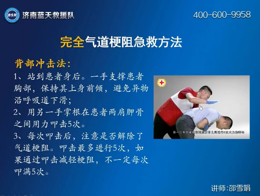 关于气道梗阻急救方法:1.轻度梗阻:如果意识清楚且有咳嗽动作,可以帮助患者咳嗽,采取轻叩背部的动作,帮助咳出异物。2.完全梗阻:如果发现患者不能说话、没有咳嗽、面色青紫,此时应该采取海姆立克腹部冲击法。如果患者能够站立,一般采取站立位,双手扶住患者腰部,患者上半身前倾,急救者一只手捂拳,空心拳放在在脐上两横指的上方,拳眼朝着患者,另一只手包住拳头,快速、用力的连续向上、向后冲击腹部,借助冲击力将异物排出来。
