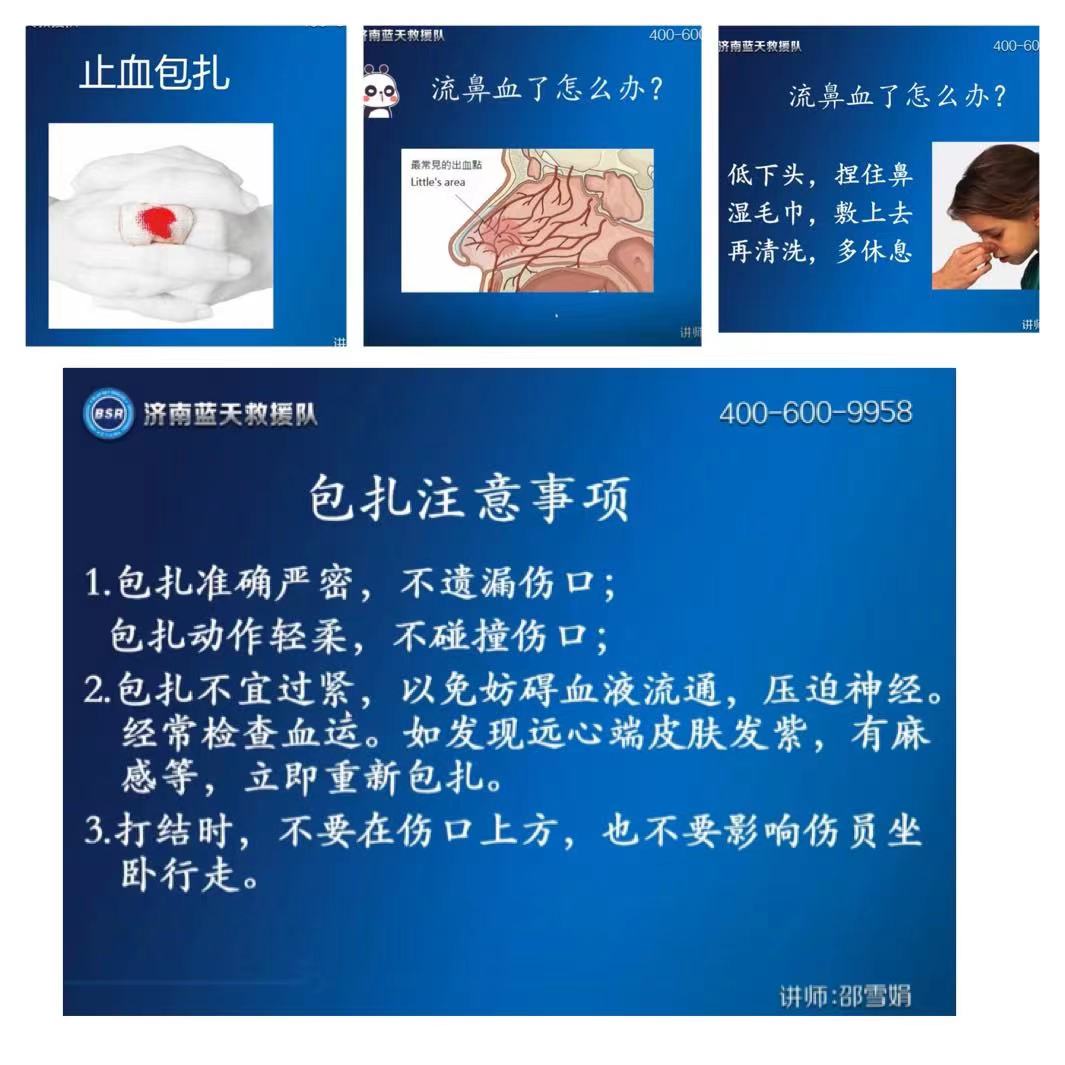 晚上七点,讲座正式开始。邵老师由浅入深地向大家讲解了止血包扎和气道梗阻急救的操作流程和相关的注意事项,通过视频演示了施救措施,形象具体。