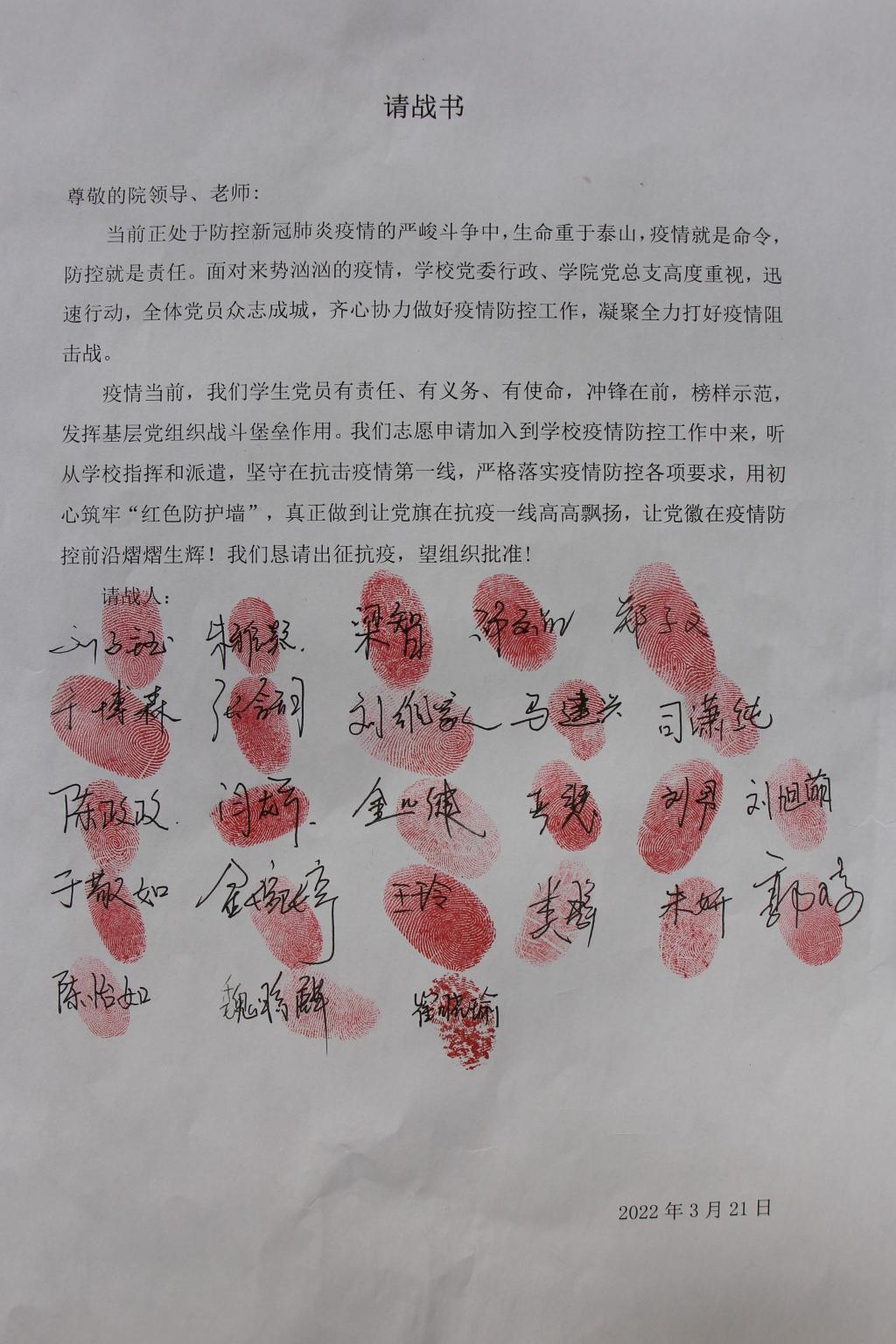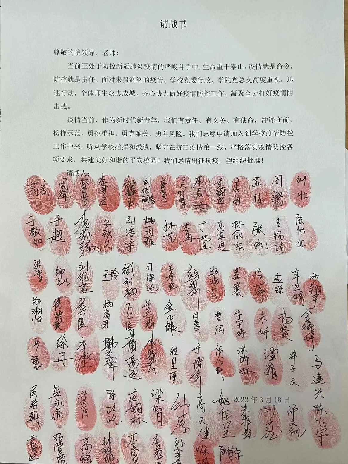 黑色的字迹,是坚定的决心;红色的手印,是赤诚的真心。一封封印着红手印的“抗疫请战书”,在疫情防控的关键时刻,体现着造型艺术学院全体学生党员和学生骨干的初心与使命,承载着新时代新青年抗击疫情的决心和信心。疫情当前,我们请战!