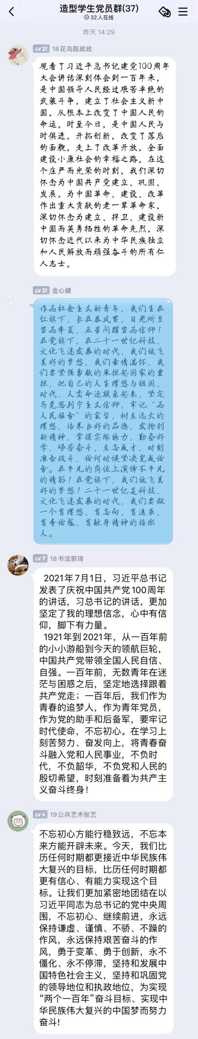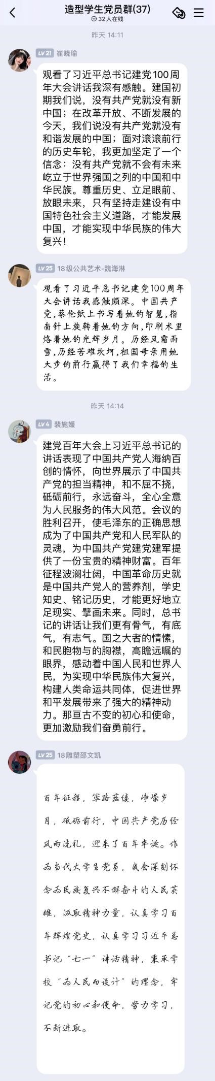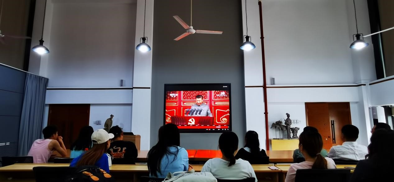 百年光辉历程,百年历史见证。7月1日上午8时,庆祝中国共产党成立100周年大会在北京天安门广场隆重举行。中共中央总书记、国家主席、中央军委主席习近平发表重要讲话。造型艺术学院学生党支部开展主题党日活动,组织师生党员共同观看大会的直播,深入贯彻学习习近平总书记在庆祝中国共产党成立一百周年大会上的重要讲话精神。