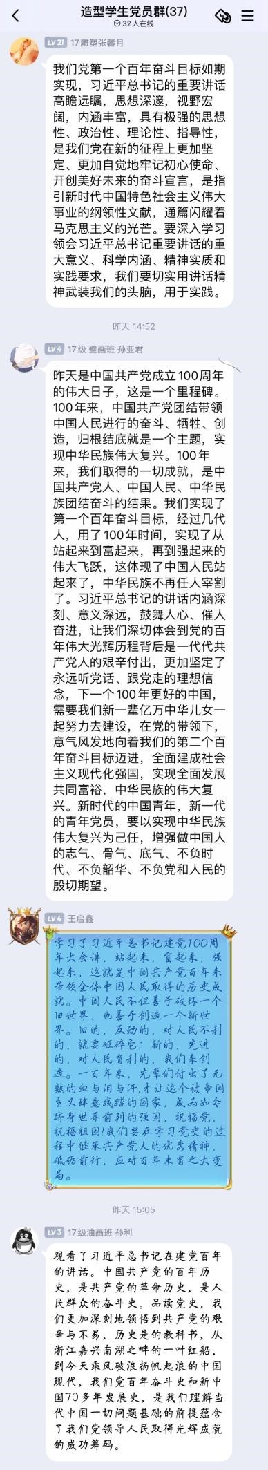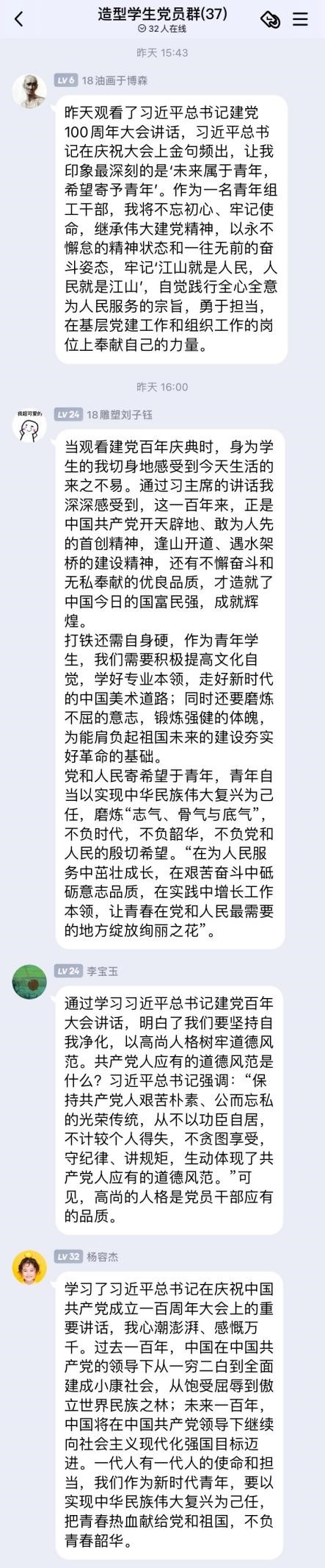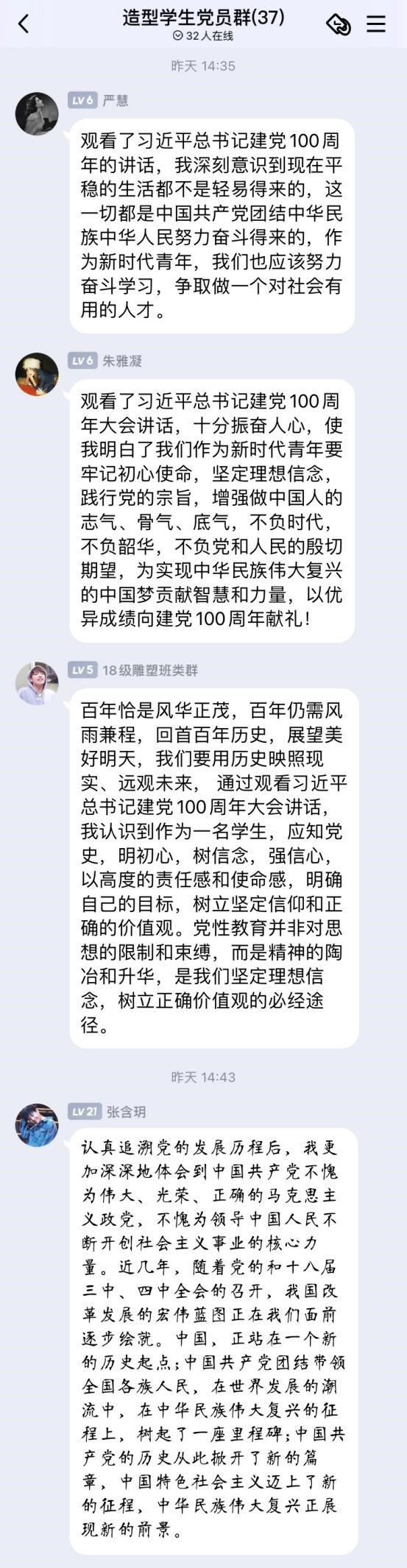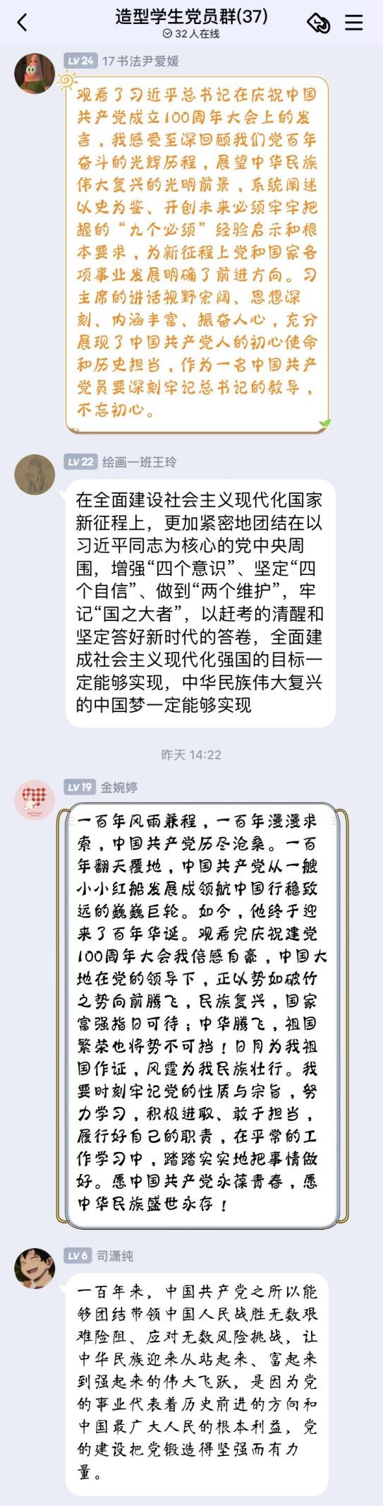 习近平总书记的讲话高瞻远瞩、催人奋进,展现了百年来中国共产党的历久弥坚、砥砺奋进的进取精神。支部全体党员表示受益匪浅:作为青年党员,要不断增强“四个意识”、坚定“四个自信”、做到“两个维护”,从本次学习中进一步感悟思想力量,深入学习贯彻习近平新时代中国特色社会主义思想,弘扬伟大建党精神。以百年为奋斗新起点,以史为鉴,开创未来!