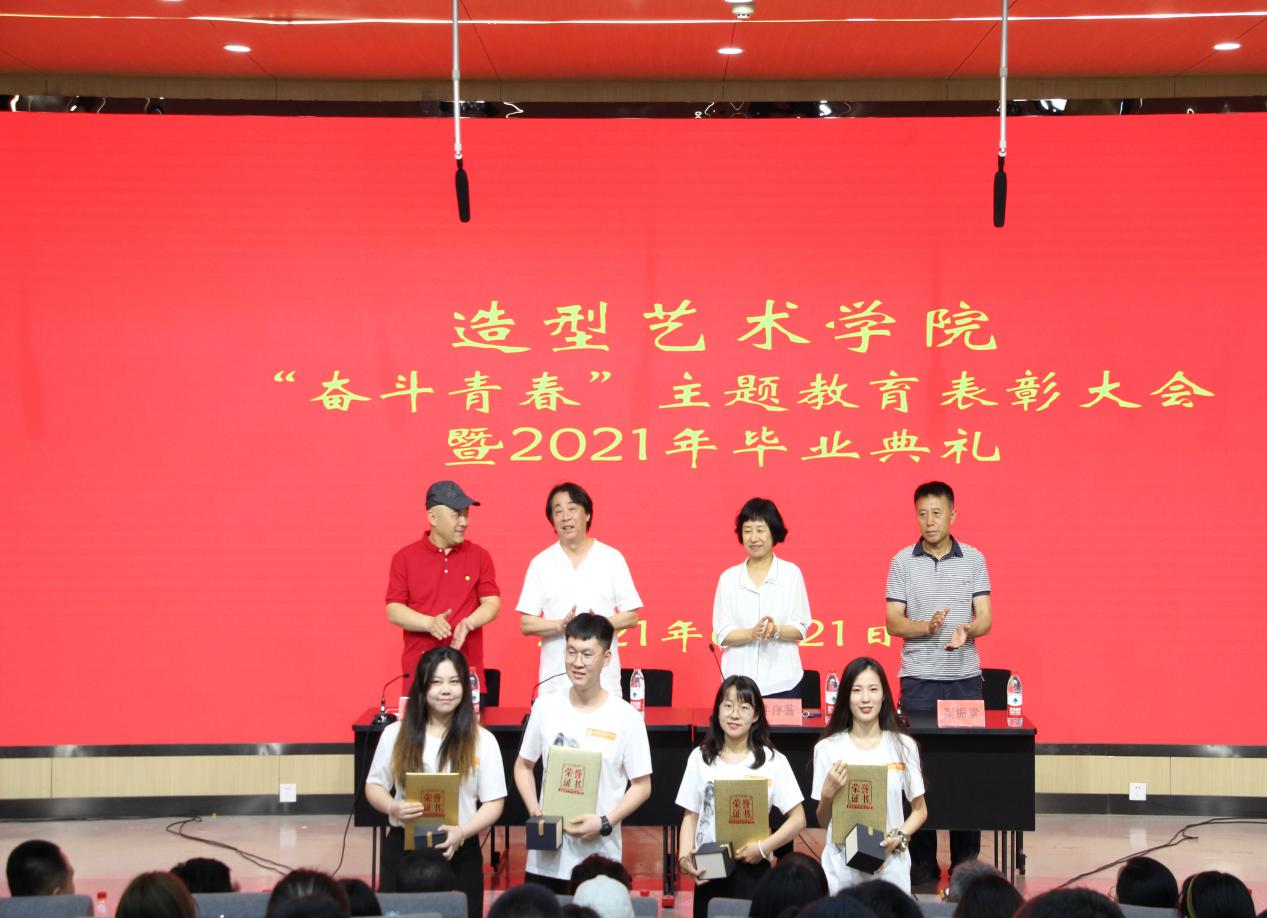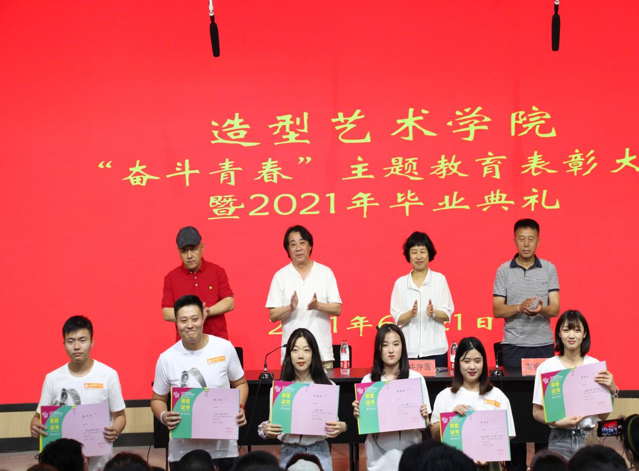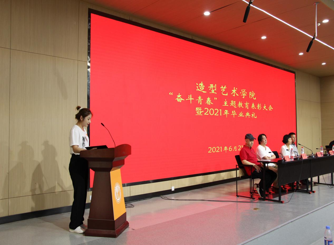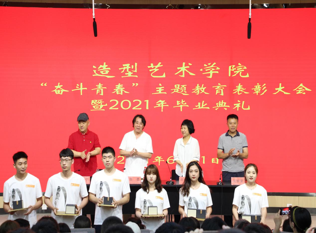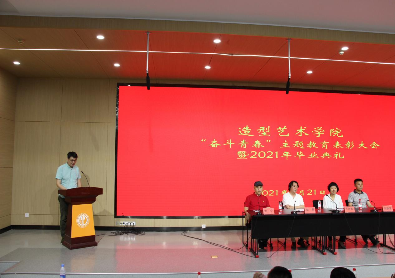 造型艺术学院在2021届毕业生中开展以“奋斗青春”为中心内容的毕业生教育,在常规教育的同时,融入实践教育内容,增强毕业生的责任感。主题教育中,造型毕业生展现出新时代大学生以家国担当为己任的良好精神风貌。为致敬党的百年华诞,表彰先进,同时培养毕业生荣校爱校意识,祝贺同学们顺利完成学业,6月21日下午,造型艺术学院于长清校区阶梯教室举办“奋斗青春”主题教育表彰大会暨2021年毕业典礼,学院领导班子、专业课教师及行政人员、学院全体2021届毕业生参加本次会议,会议由毕业班辅导员许威治主持。