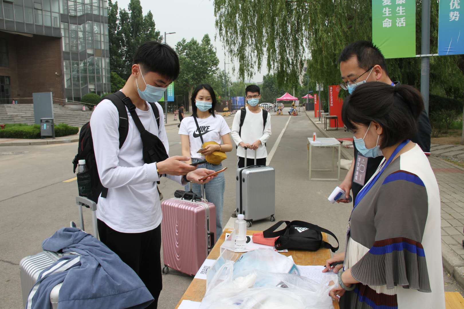 返校前,学院点对点对接返校学生,确保准确返程信息,根据学校统筹做好接站服务。学院教职员工提前完成场地布置、物资准备、教室卫生打扫等工作。报到当天,分工有序,车站接站、行李消毒、引导核验、体温检测、返校信息登记、防疫物资发放等各个环节规范有序、组织有力,学院领导、辅导员及专业教师在学校西南门返校报到点迎接同学们的到来。省外返校学生在辅导员的引导下,逐一进行了核酸检测。整个过程严谨细致,确保了学生平安返校。