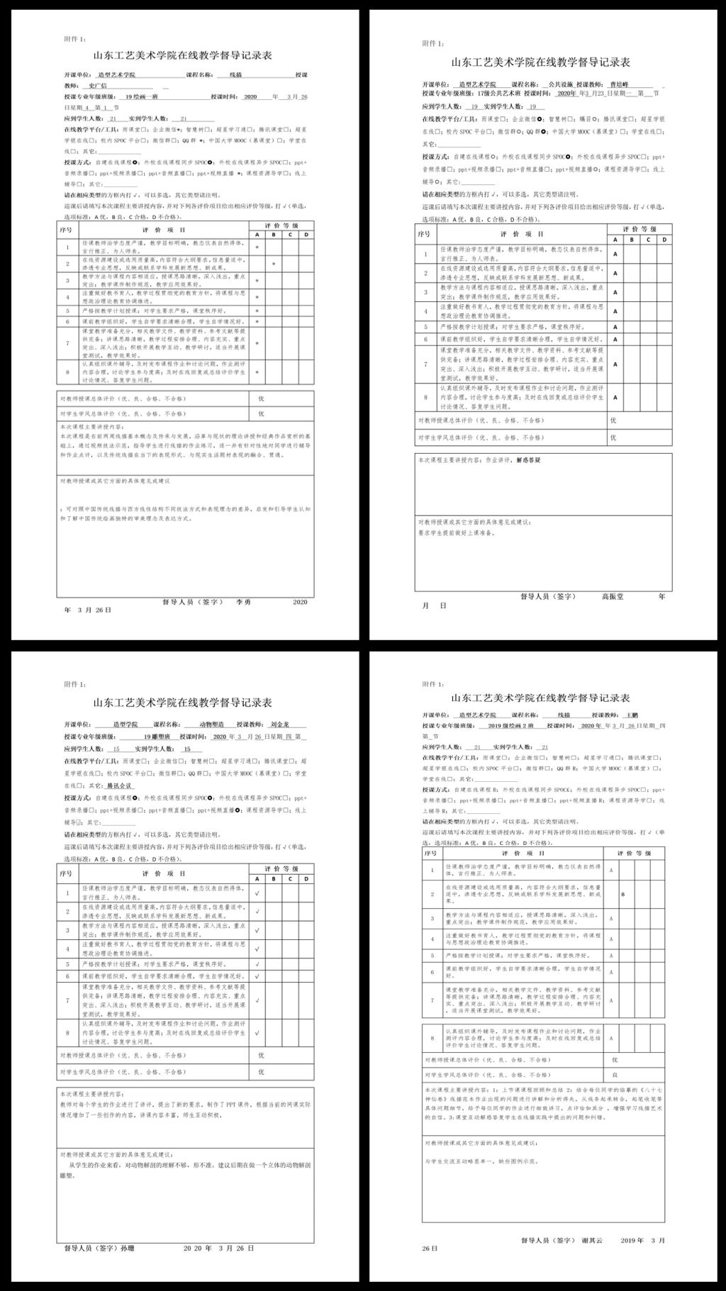 为扎实推进线上教学,遵循“标准不降、形式多样、方式灵活、强调效果、保证质量”的原则,自开学之日起,由院领导、教授、教研室主任、教学秘书组成督导小组,全程参与线上教学的进度、内容、效果和质量督导、协调和指导,及时反馈教与学的信息,及时与授课老师沟通引导,并将自己的丰富教学经验分享给年轻教师,有力的推动课堂教学工作的进行。本周线上听课、评课9人次,“课堂”均采用启发式教学,注重作业讲评、答疑解惑、单元小节的互动环节,活跃课堂的气氛,增强学生参与感。“非常时期”的“非常课堂”期待同学们拿出好的作品,保障线上教学取得优异成绩。