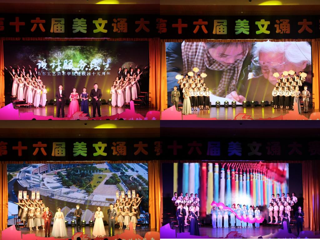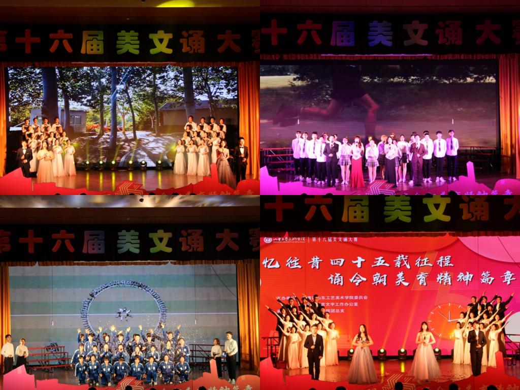 比赛中,现代手工艺术学院代表队诵读了《忆往昔,四十五载峥嵘岁月》,他们斗志昂扬,怀揣对未来的憧憬与向往,回顾工美四十五载的辉煌历史;数字艺术与传媒学院代表队诵读了《四十五载我著史,匠心独运我传承》,他们满怀希望,踏着岁月的印记,歌颂母校多年的坚守与匠心;视觉传达设计学院代表队带来了《匠心有影微云外,踏遍千山守月明》,他们用层层递进的情感,描绘出工美欲出红日、缱绻微风的动人画面;服装学院代表队诵读了《绘往昔画卷,绽今朝芳华》,他们胸怀万里世界,放眼无限未来,他们坚信“美育精神”必将长兴;人文艺术学院代表队带来了《赞歌》,他们巧用历史典故,以古鉴今,表达自己永不言弃、不忘初心的誓言;造型艺术学院代表队诵读《以育成之美,美人之美》,他们怀着对家国的赤诚之心,用声情并茂的朗诵表达着山工艺学子对“美育精神”的诠释;应用设计学院代表队诵读了《至美工艺,再谱华章》,他们传递大千世界的绚丽多彩,他们寻找前人的足迹延续今朝;建筑与景观设计学院代表队带来了《浮生过往,又见归来》,他们满怀真挚的感情,生动地表现了即使前路坎坷,依旧坚守初心的精神;工业设计学院代表队诵读了《浅吟四十五载匠心》,他们用满腔的热血和动人的言语,让生命为成长而奋力拼搏。各代表队明确突出的主题表达,生动形象的舞台展现,慷慨激昂的情感流露赢得了场下的阵阵喝彩。