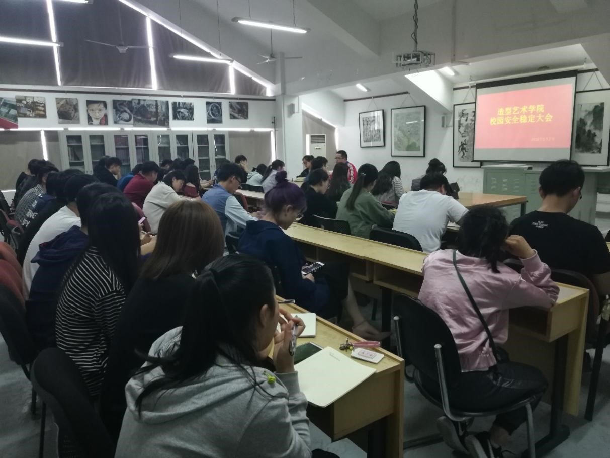 为贯彻落实学校安全稳定工作精神,维护校园良好的学习生活秩序 ,2018年5月2日下午,造型艺术学院于综合楼四楼多媒体召开了校园安全稳定教育大会。本次大会由辅导员王晓琼、许威治主持,各年级全体班委参加。