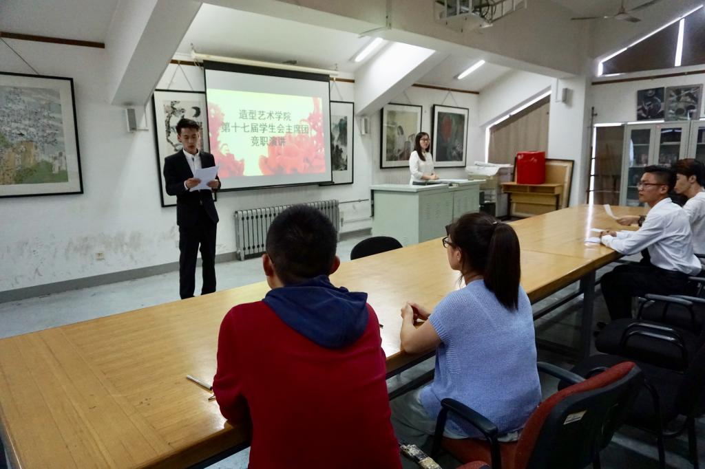 首先,由十六届学生会主席李沛霖总结了上一年学生会举办的各种活动以及获得的主要成果,并感谢他们为造型艺术学院学生会所做的努力和工作。随后,参加此次竞选的七名学生会部长按照顺序依次上台演讲,通过各位主席团成员、部长的投票选举,确定了造型艺术学院第十七届的主席团成员。接着,参加竞选部长的干事们对所竞选的部门进行演讲,并对学生会日常工作中的各项问题发表了自己的见解。在演讲过程中,同学们积极表现自己,以激昂的演讲和敏捷的思维展现自己的工作经验和各方面能力,以及为老师、同学服务的热情和意愿,精彩的演讲获得台下掌声阵阵。