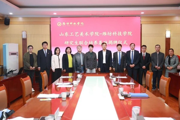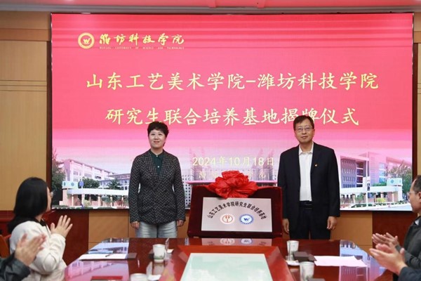 数字艺术与传媒学院院长吴向阳与潍坊科技学院艺术学院院长姜亦金签署研究生联合培养基地协议,研究生处处长赵屹与潍坊科技学院校长、党委副书记魏华中为研究生联合培养基地揭牌。