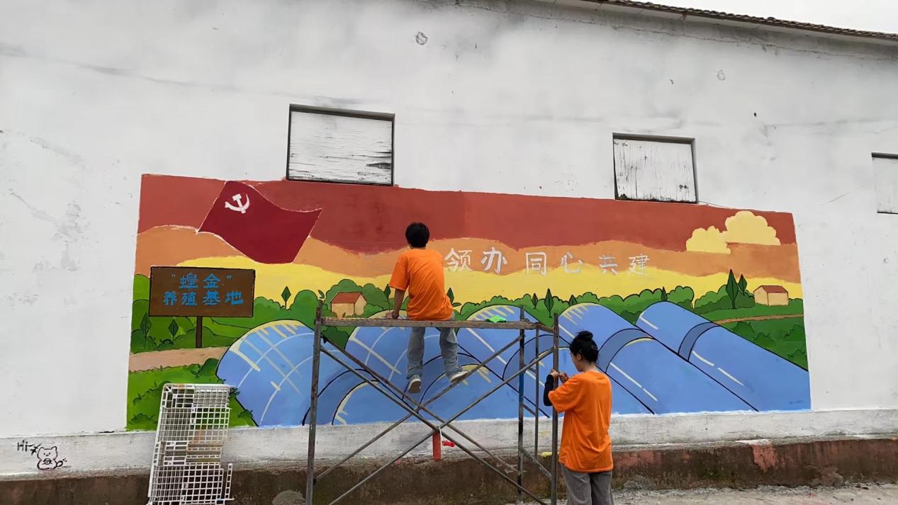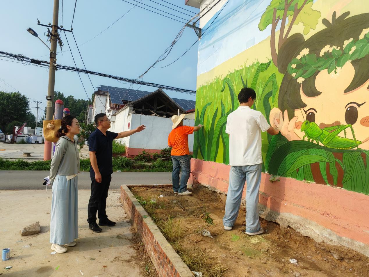 7月13日,实践团队成员进行实地考察,辛集镇人大主席侯合雷、凤头村省派第一书记王其仁、党支部书记秦其斌与团队成员座谈交流,他们对社会实践队伍表示热烈欢迎,希望团队发挥专业优势,结合当地特色产业设计创意墙绘,助力打造乡土特色品牌。团队师生将蚂蚱产业、新农人等元素巧妙融入作品设计,反映出实践团队成员对当地乡村产业振兴的美好祝愿。