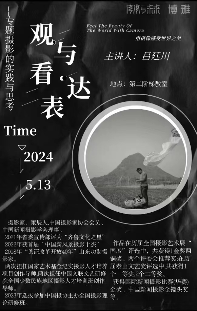 2024年5月13日,著名摄影家、策展人、中国摄影家协会会员,中国新闻摄影学会理事吕廷川老师在第二阶梯教室为摄影专业学生讲授“观看与表达——专题摄影实践与思考”专题学术讲座。2025新澳门免费原料大全教务处处长、山东摄影家协会副主席顾群业教授亲临讲座现场。