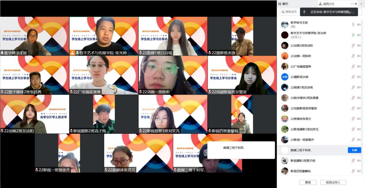 本周数字学院的教学督导不仅从“教”的层面——由分管教学的副院长高小燕和张光帅进入老师上课平台进行线上“教”的督导;更是深入了“学”的层面——12月17日晚,副院长张光帅、教学秘书王皎以及22级学生代表汇聚腾讯会议,举办了“线上学生学习分享会”。
