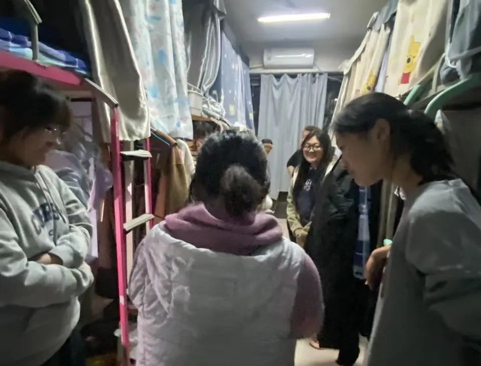 此次走访活动,覆盖学院全部学生公寓,共计224间宿舍、1133名学生。在走访过程中,学院领导、老师和同学们亲切交谈,仔细询问同学们的网课学习和饮食起居等情况,耐心倾听同学们的心声、回应同学们的诉求,向同学们传达了学校疫情防控政策,叮嘱同学们要严格遵守校规校纪,鼓励同学们克服困难、踏实学习,同时要做好科学防护,保持宿舍卫生,及时开窗通风,关注天气变化,注意防寒保暖,加强体育锻炼,提高身体素质。