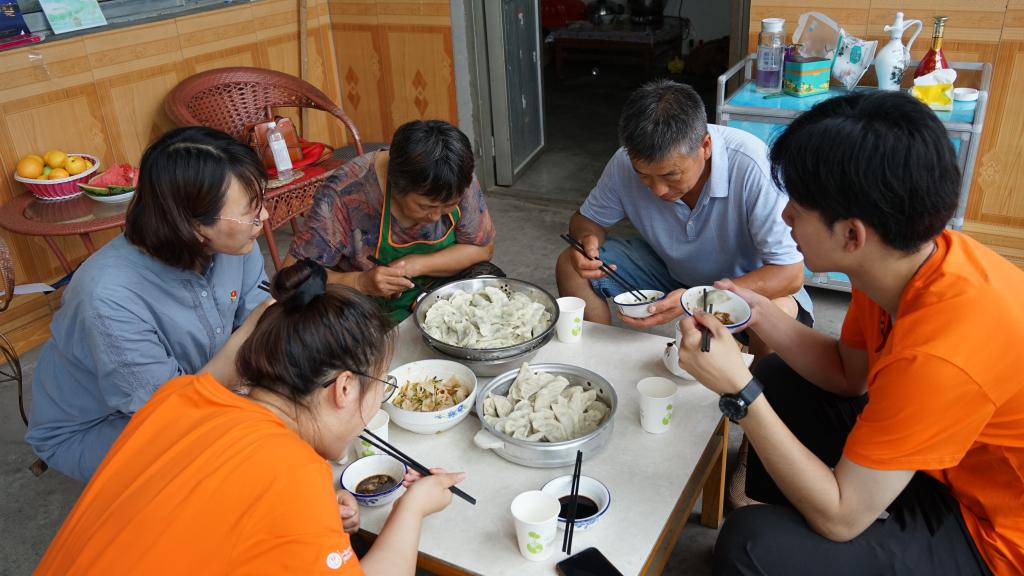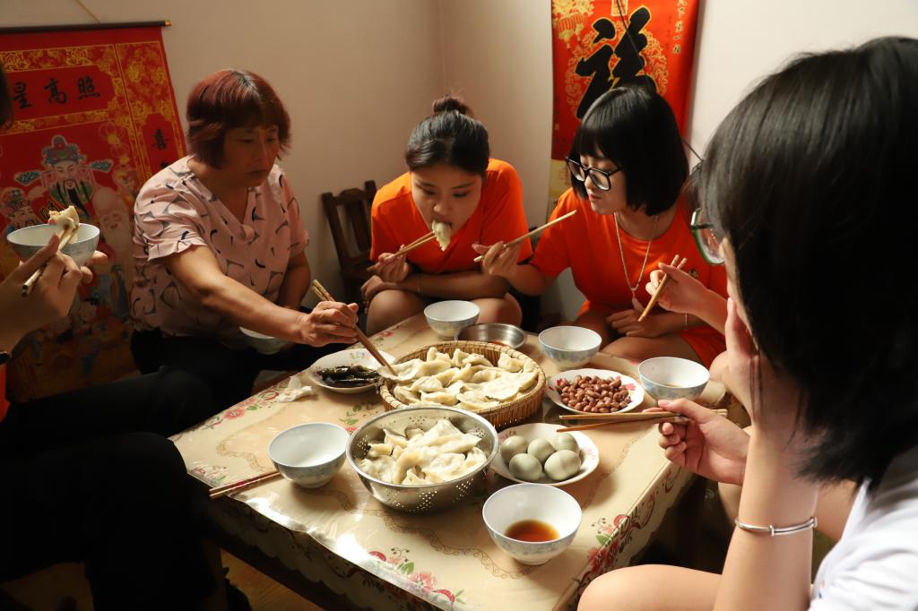 在农户的热情邀请下,同学们进入农户家中帮助准备饭菜。一边在准备馅料,一边在制作着面皮,伴着农户与同学们轻松愉悦的聊天声一幅和谐温馨的画卷呈现在眼前。同学们品尝着自己亲手制作的水饺与晚饭,幸福的笑容洋溢在每一个人的脸上。