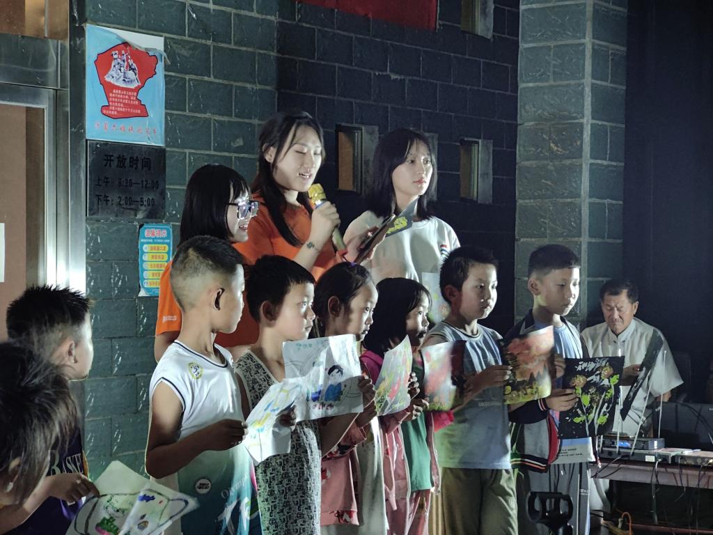 7月5日晚,实践团于沂蒙六姐妹纪念馆前开展文艺进村公益联欢晚会,烟庄村民们冒雨参加。本次文艺晚会,由同学们与村民共同自编节目,孩子们拿着作品登台展示了支教成果,全体小朋友合唱了一首《孤勇者》掀起了晚会的高潮,晚会在动感的旋律、悦耳的歌声、优美的舞姿中结束。