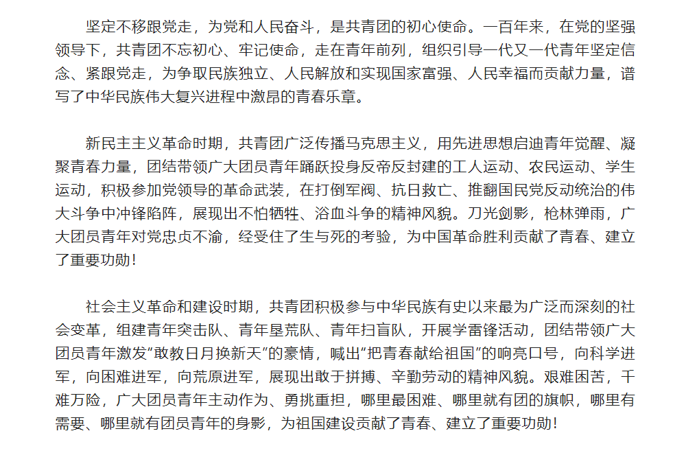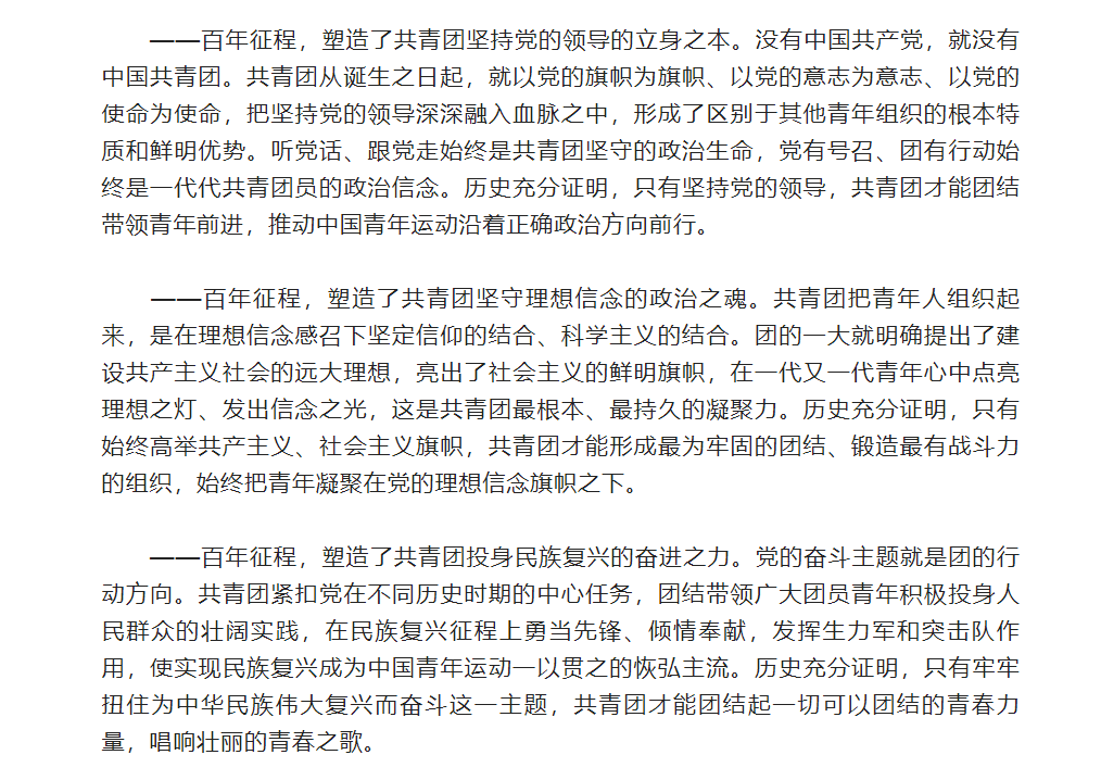 2022年是中国共产主义青年团成立一百周年,一百年栉风沐雨,共青团始终坚定不移跟党走,一百年来,一代又一代青年用青春热血书写了彪炳史册的壮丽篇章,在学校期间我认真上好团课,在学习中我了解到中国共青团走过了光辉历程,共青团以它独特的魅力吸引着全中国先进青年不断加入其中,中国共产主义青年团坚决拥护中国共产党的纲领,以马克思列宁主义、毛泽东思想、邓小平理论、“三个代表”重要思想、科学发展观、习近平新时代中国特色社会主义思想为行为准则。