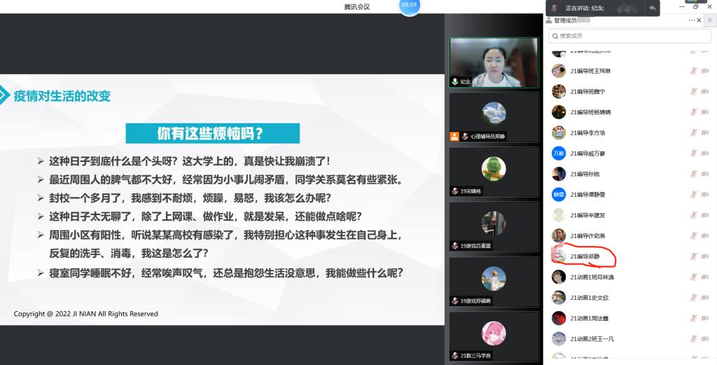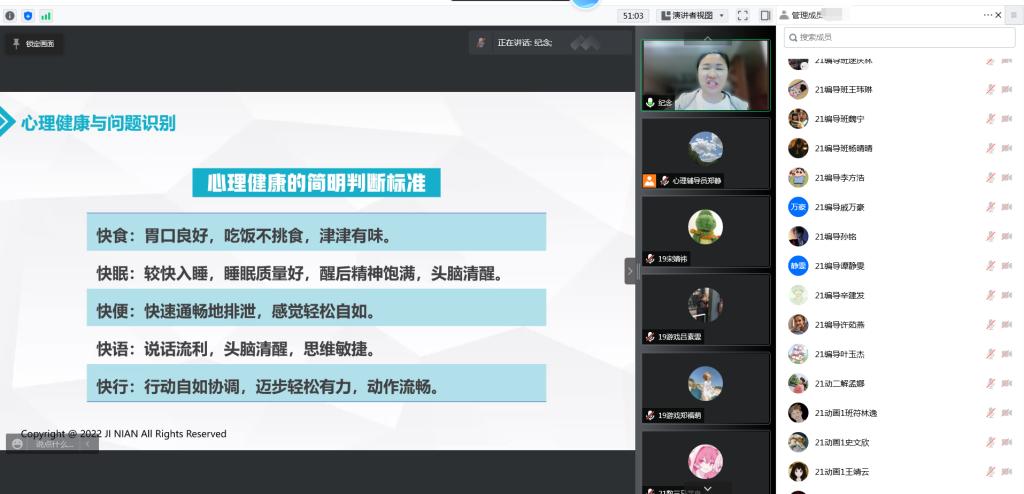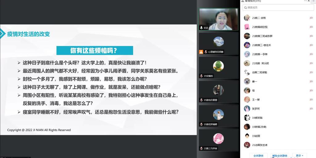 纪念老师主要从心理健康与问题识别、常见心理问题的自我调适、助人的态度与技能三个方面,详细阐述了疫情期间该如何正确认识个人心理健康,如何调适自我和帮助他人。