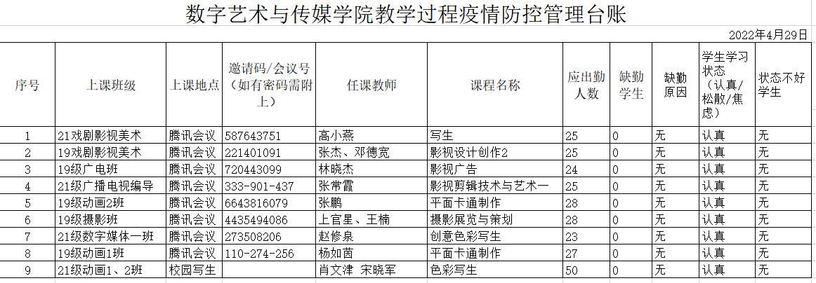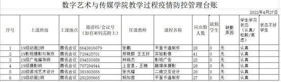 本学期第9周,也是线上教学第5周,数字艺术与传媒学院本周共有28个班上课,涉及学生682人,其中24人为校外网课学生,开展专业课19门,线上授课教师33人,学生到课率100%。