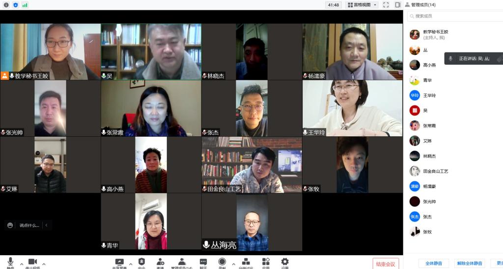 会上高小燕首先就毕业创作和论文进展情况向各教研室老师布置了相关任务。吴向阳就今日开始线上上课的情况和督导情况向大家做了介绍,班子成员和辅导员到宿舍就学习情况进行了交流。接下来的网课要求教研室主任们跟各位老师强调上课秩序和课堂要求,开展教学督导和听课工作,按照线下课程的时间按时上下课控制好上课节奏,关注学生反应并合理使用雨课堂及其它教学软件,在讲授与互动环节开启摄像头,做好课程总结与课堂记录。会议传达了学校关于“山东手造”的相关工作,各专业如何结合毕设和联动来切入并行程可行性的方案。最后,对一本流课程工作、科研工作进行了讨论和布置。